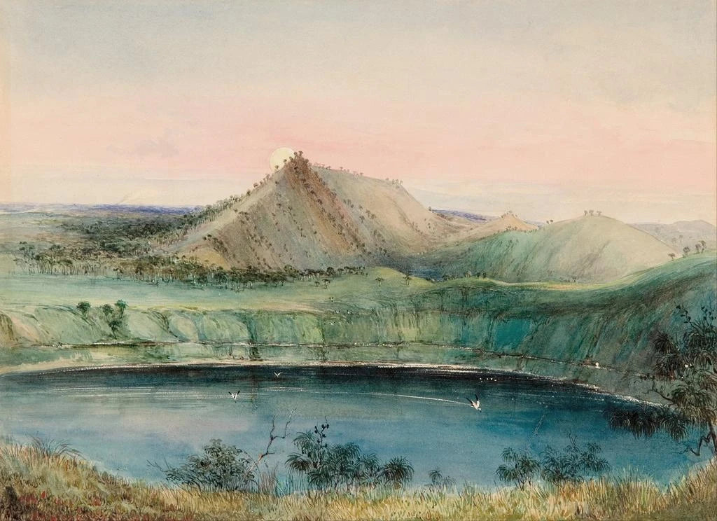 George French Angas, active in the 19th century, is renowned for his works that celebrate the beauty and diversity of Australia. Originally from England, he was influenced by the Romantic movement and realism, seeking to capture landscapes and scenes of everyday life. Angas traveled across Australia, documenting his discoveries through paintings and illustrations. His work played a vital role in promoting Australian art, and his artworks continue to inspire contemporary artists. Lac Bleu, Mont Gambier is a perfect example of his talent for immortalizing the natural splendor of his adopted country.