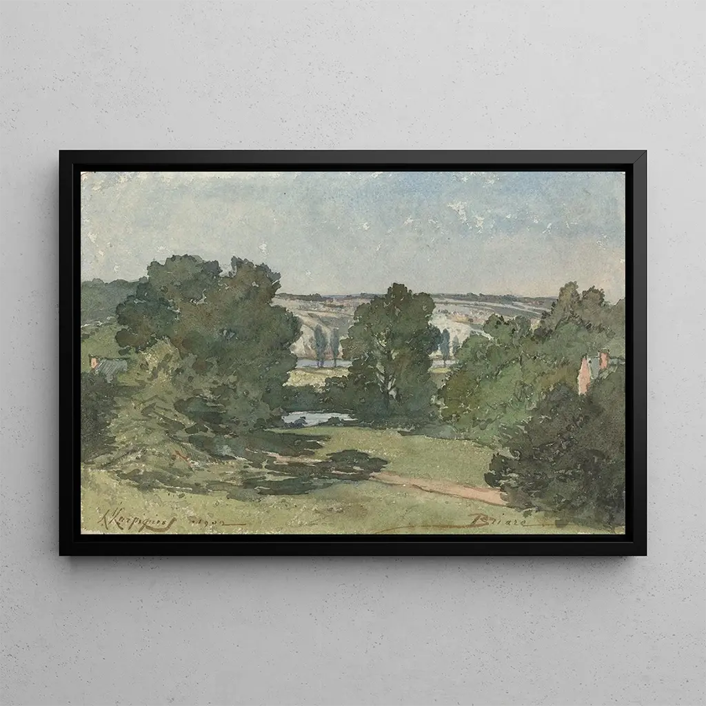 The Henri-Joseph Harpignies art print of Briare is a work that evokes the serenity of a bucolic landscape. The shades of green and blue blend harmoniously, creating a soothing atmosphere. The watercolor technique, with its delicate touches, captures the natural light dancing on the calm waters. The eye is immediately drawn to the balanced composition, where each element seems to find its place in this living painting. The overall invites gentle contemplation, like a walk by the water, where time seems to stand still.