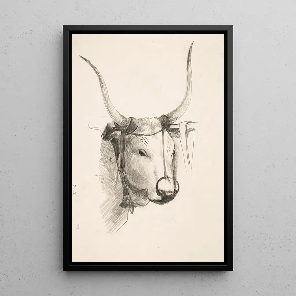 The art print of Henry Ericsson's Head of a Bull evokes a striking animal power. This painting, with dark tones and pronounced contrasts, highlights the strength and majesty of this iconic animal. The artist's technique, blending realism and expressionism, creates an atmosphere that is both intimidating and fascinating. The meticulous details of the horns and muscles, combined with a dark background, emphasize the imposing presence of the bull's head, inviting the viewer to a deep and thoughtful contemplation.