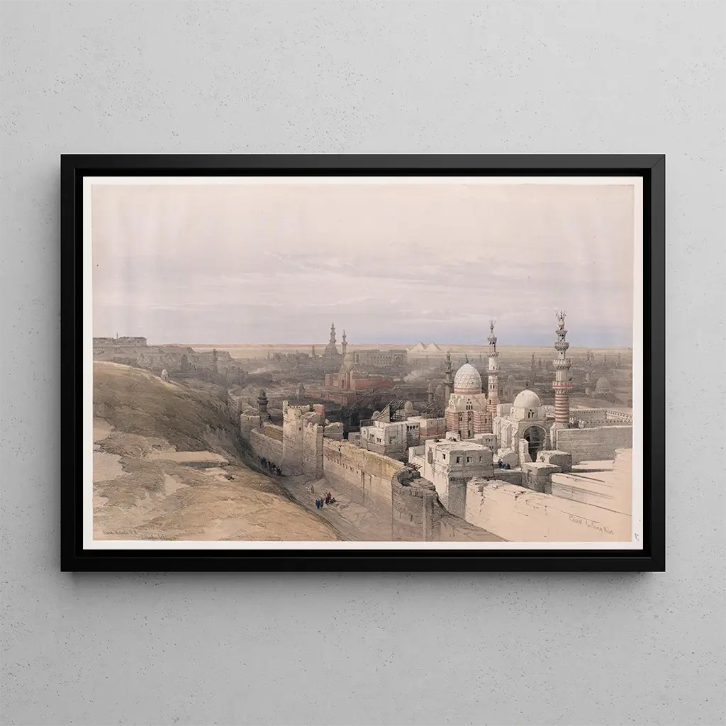 The art print "Cairo from the West" by David Roberts instantly transports us to the heart of 19th-century Egypt. This work, created with watercolor, stands out for its warm and vibrant colors, evoking the golden light of sunrise on the city's historic buildings. The composition, rich in detail, features tall minarets and flat-roofed houses, creating an atmosphere that is both peaceful and lively. The artist succeeds in capturing the essence of daily life in Cairo, inviting the viewer to contemplate this lively scene where the Orient reveals itself in all its splendor.