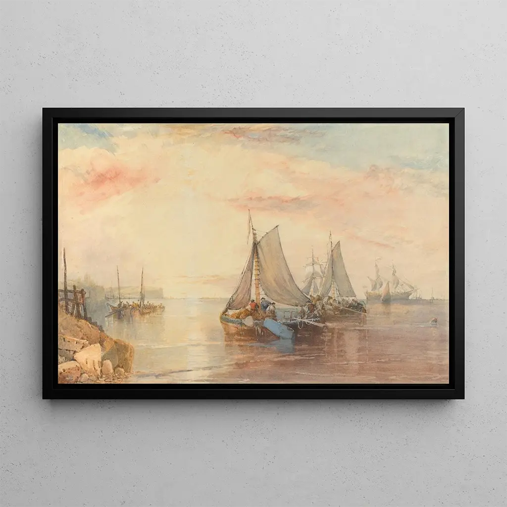 Ships in Calm Weather: A Maritime Serenity In the artwork Ships in Calm Weather, James Baker Pyne offers us a soothing vision of the sea, where sailboats rest peacefully on calm waters. The balanced composition, with its gentle lines and delicate shapes, evokes an atmosphere of tranquility and contemplation. The shades of blue and white, skillfully blended, create a light effect that reflects the softness of a windless day. Pyne, through his mastery of oil painting, manages to capture the ephemeral beauty of this moment, inviting the viewer to escape to distant horizons. James Baker Pyne: a master of marine landscape James Baker Pyne, active in the 19th century, is renowned for his marine landscapes and representations of nature. Influenced by the Romantic movement, he develops a style that combines realism and lyricism, capturing the majesty of the seas and skies. His works, often imbued with a melancholic atmosphere, testify to his love for the sea and his desire to convey deep emotions through his paintings. Pyne has secured a place in art history, influencing many contemporary and future artists with his unique approach to landscape. A decorative acquisition with multiple assets The art print of Ships in Calm Weather is an ideal decorative choice to bring a touch of serenity to your interior. Whether in a living room, office, or bedroom, this piece will appeal through its print quality and color fidelity. By integrating this artwork into your decor, you create a space conducive to relaxation and contemplation, while adding a piece of art that evokes the timeless beauty of the sea and marine landscapes.