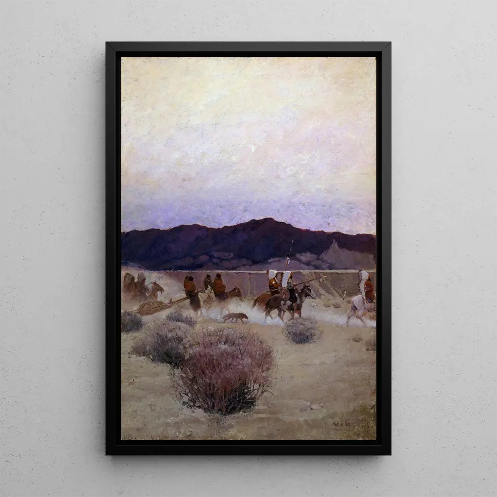 Déplacement de camp : une scène de vie en pleine nature Dans "Déplacement de camp", N. C. Wyeth capture l'essence d'une aventure en plein air. La toile dépeint un groupe de pionniers en train de plier bagage, entourés d'une nature luxuriante. Les couleurs chaudes et terreuses évoquent une atmosphère de camaraderie et de détermination. La lumière douce du crépuscule illumine les visages, tandis que les détails minutieux des équipements et des vêtements témoignent d'une attention particulière à l'authenticité. Cette œuvre invite le spectateur à ressentir l'odeur de la terre humide et le bruit des feuilles sous les pas, créant une immersion totale dans ce moment de transition. N. C. Wyeth : un maître de l'illustration américaine Né en 1882, N. C. Wyeth est l'un des illustrateurs les plus influents du début du XXe siècle, connu pour ses œuvres qui mêlent art et narration. Il a été fortement influencé par les grands maîtres de la peinture classique, tout en développant un style distinctif qui allie réalisme et romantisme. Wyeth a travaillé principalement dans le domaine de l'illustration de livres, mais ses toiles, comme "Déplacement de camp", témoignent de son talent pour capturer des récits visuels. Son travail a marqué une époque où l'illustration était un moyen puissant de communication, et il a contribué à façonner l'imaginaire collectif américain. Une acquisition décorative aux multiples atouts La reproduction de "Déplacement de camp" constitue une pièce maîtresse pour tout intérieur, que ce soit dans un salon, un bureau ou une chambre. Sa qualité d'impression garantit une fidélité aux couleurs et aux détails de l'œuvre originale, apportant une touche d'authenticité à votre décoration. Ce tableau évoque des thèmes d'aventure et de nature, créant une atmosphère chaleureuse et accueillante. En intégrant cette toile dans votre espace, vous invitez non seulement l'art dans votre quotidien, mais aussi une histoire riche qui saura captiver vos invités et enrichir votre environnement.