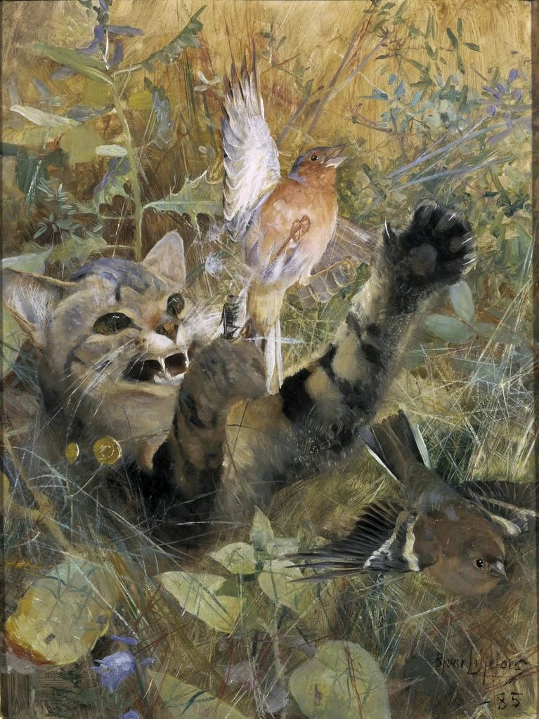 Painting A cat and a chaffinch - Bruno Liljefors | Art print
