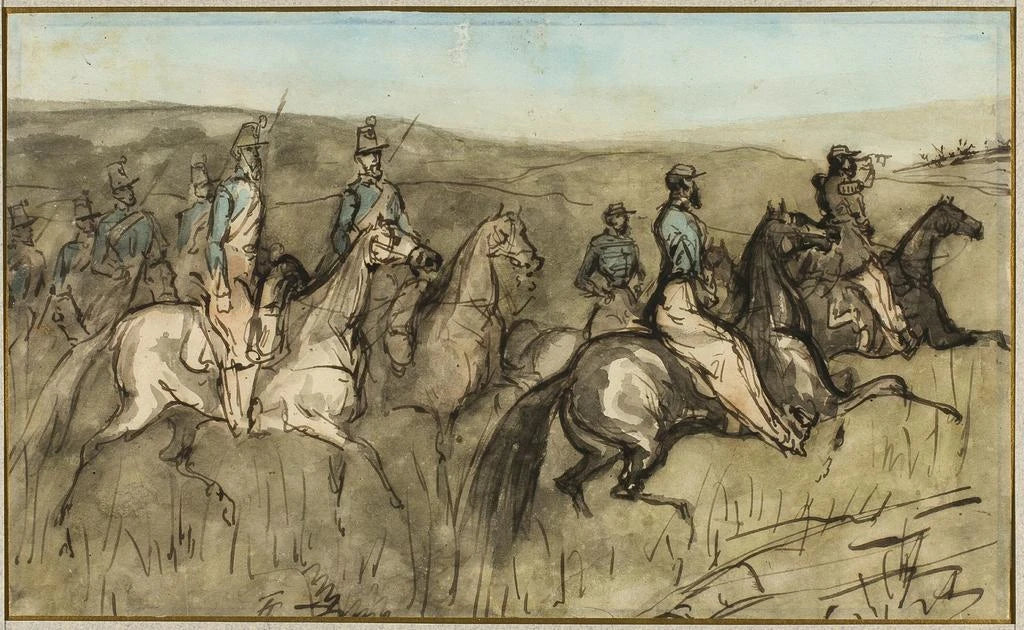 Exercise of Cavalry in a Meadow: a lively scene of movement and harmony In this art print of Exercise of Cavalry in a Meadow, Constantin Guys captures a dynamic scene where riders and horses intertwine in a ballet of movements. The vivid colors, blending shades of lush green and touches of earth tones, evoke the beauty of a sunny day. The artist's technique, combining watercolor and drawing, lends a lightness to the overall composition while highlighting the details of the mounts and uniforms. The atmosphere conveyed by this canvas is both joyful and energetic, inviting the viewer to feel the excitement of military exercise. Constantin Guys: a witness of his time Born in 1802, Constantin Guys is often considered one of the first artists to document modern life through his art. Influenced by the Romantic movement, he stands out for his ability to capture scenes of everyday life, including military events and landscapes. Active in the 19th century, Guys was able to immortalize historic moments while adding a personal touch to his works. His style, both realistic and poetic, reflects the evolution of art during a period of great upheavals in Europe, making him an essential figure of his era. A decorative acquisition with multiple assets The art print of Exercise of Cavalry in a Meadow is a decorative piece that will enrich your interior, whether in a living room, office, or bedroom. Its print quality guarantees remarkable fidelity to the details of the original work, while its aesthetic appeal adds a touch of dynamism to your decor. By choosing this canvas, you opt for a piece that not only beautifies a space but also tells a story — that of a time when art and military life intertwined with elegance and passion.