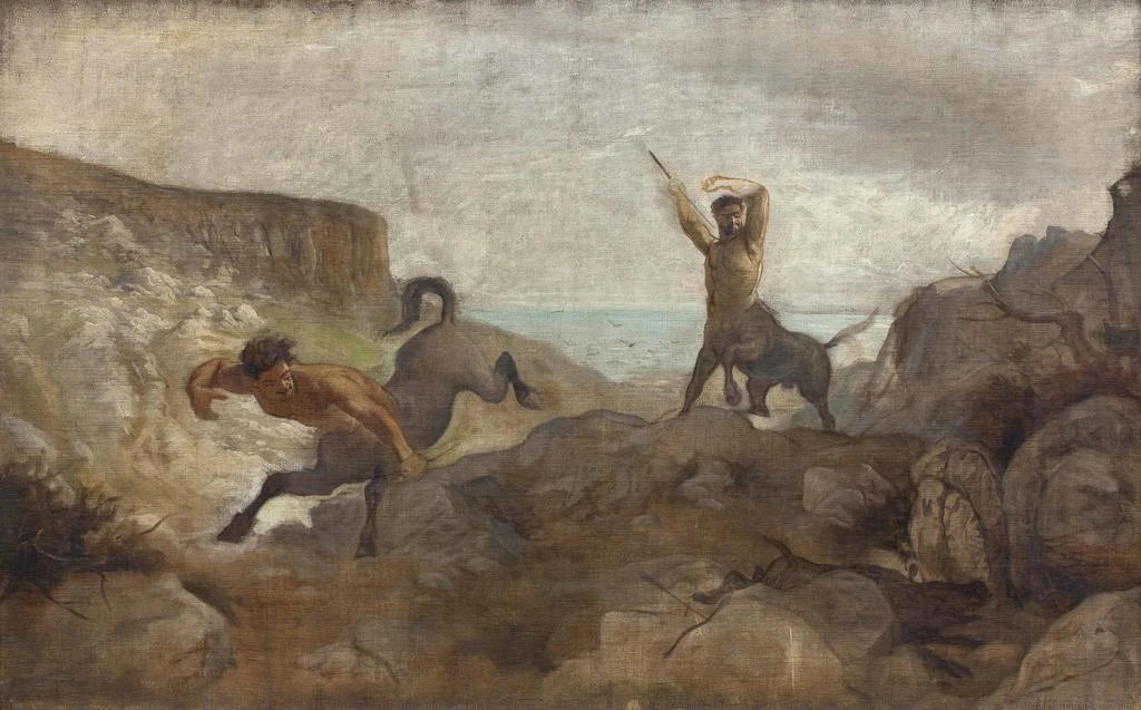 In this captivating artwork, the Boar Hunt Centaur, Ludvig Abelin Schou immerses us in a mythological world where nature and humanity intersect. The dynamic composition of the canvas, with its flowing lines and vibrant colors, evokes a scene of frantic hunting. The earthy tones and flashes of light create an atmosphere that is both wild and majestic, while the centaur, an iconic figure of Greek mythology, embodies raw strength and harmony with nature. Schou's technique, blending realism and romanticism, brings this scene to life, inviting the viewer to feel the intensity of the action.