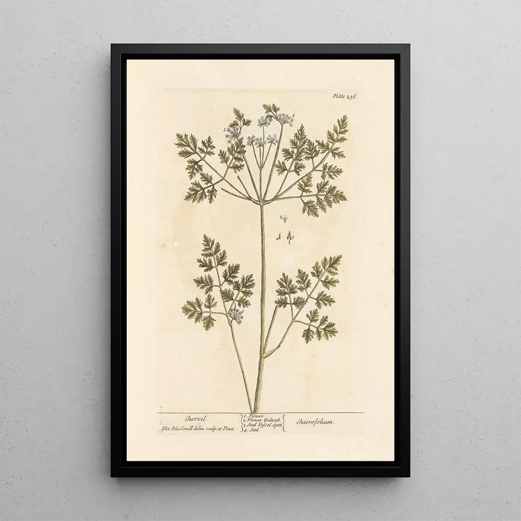 Cerfeuil : an ode to natural simplicity The art print of Cerfeuil by Elizabeth Blackwell invites us to appreciate the understated beauty of this aromatic plant. With its delicate leaves and small white flowers, this piece perfectly illustrates the finesse of nature. The shades of green, subtly nuanced, create a calming and warm atmosphere. The watercolor technique, mastered by Blackwell, captures the lightness and transparency of the leaves, while highlighting the elegant simplicity of this plant. This botanical representation is a true invitation to contemplate nature. Elizabeth Blackwell : a pioneer of botanical art Elizabeth Blackwell, active in the 18th century, left a mark on the history of botanical illustration through her unique approach and dedication to plant depiction. Her flagship work, "A Curious Herbal," not only served as a reference for botanists but also paved the way for the recognition of women in this field. Influenced by the scientific advances of her time, Blackwell knew how to combine precision and aesthetics, creating illustrations that are both informative and artistic. Her work has had a lasting impact on botanical art, making her an iconic figure of her era. A decorative acquisition with multiple assets The art print of Cerfeuil is an ideal decorative choice to add a touch of greenery to your interior, whether in a kitchen, living room, or office. Its printing quality ensures fidelity to the details and colors of the original artwork, offering a refined aesthetic. By integrating this canvas into your decor, you create a welcoming and inspiring space, while paying tribute to botanical art. This artwork, in addition to being a decorative element, invites serenity and a connection with nature, subtly and elegantly enriching your daily life.