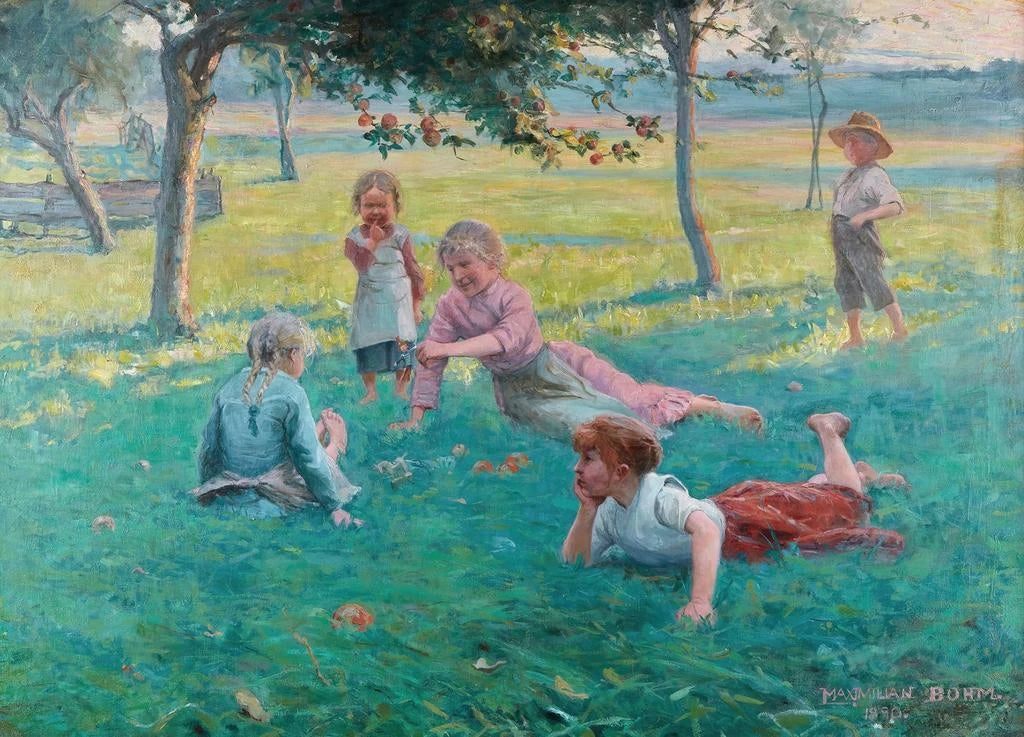 Dans cette œuvre vibrante, Max Bohm nous plonge au cœur d'un moment paisible où des enfants s'étendent dans l'herbe, absorbés par la douceur de la nature. Les couleurs éclatantes de la toile, allant des verts luxuriants aux touches dorées du soleil, créent une atmosphère de joie et de tranquillité. La technique impressionniste de Bohm, avec ses coups de pinceau fluides et sa lumière éclatante, évoque une sensation de mouvement et de vie. Chaque détail, des rires des enfants aux ombres projetées par les arbres, contribue à une scène empreinte de bonheur et d'innocence, invitant le spectateur à s'évader dans cet univers idyllique.