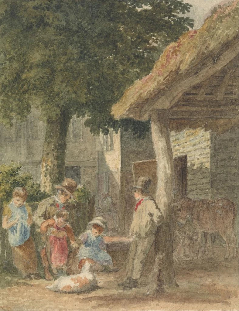 Enfants avec un chien dans la cour de la ferme - Robert Hills