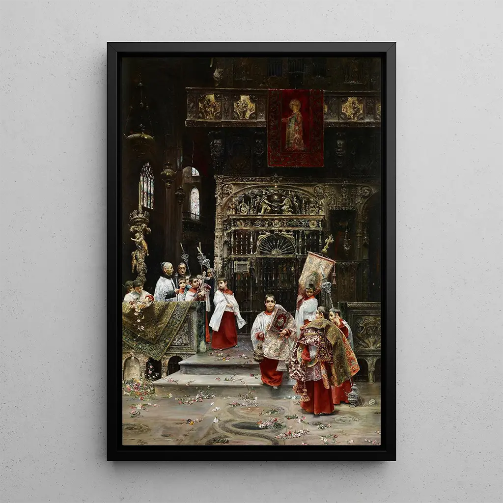 "Enfants de chœur" by José Gallegos y Arnosa is an art print that depicts the purity and innocence of youth through the gaze of young boys in liturgical attire. The soft and luminous colors, combined with a balanced composition, convey an atmosphere of serenity and devotion. Gallegos y Arnosa employs painting techniques that highlight the delicate expressions of children, creating a piece imbued with tenderness and spirituality. Every detail, from the faces to the drapery, is carefully crafted to evoke a sense of peace and contemplation.