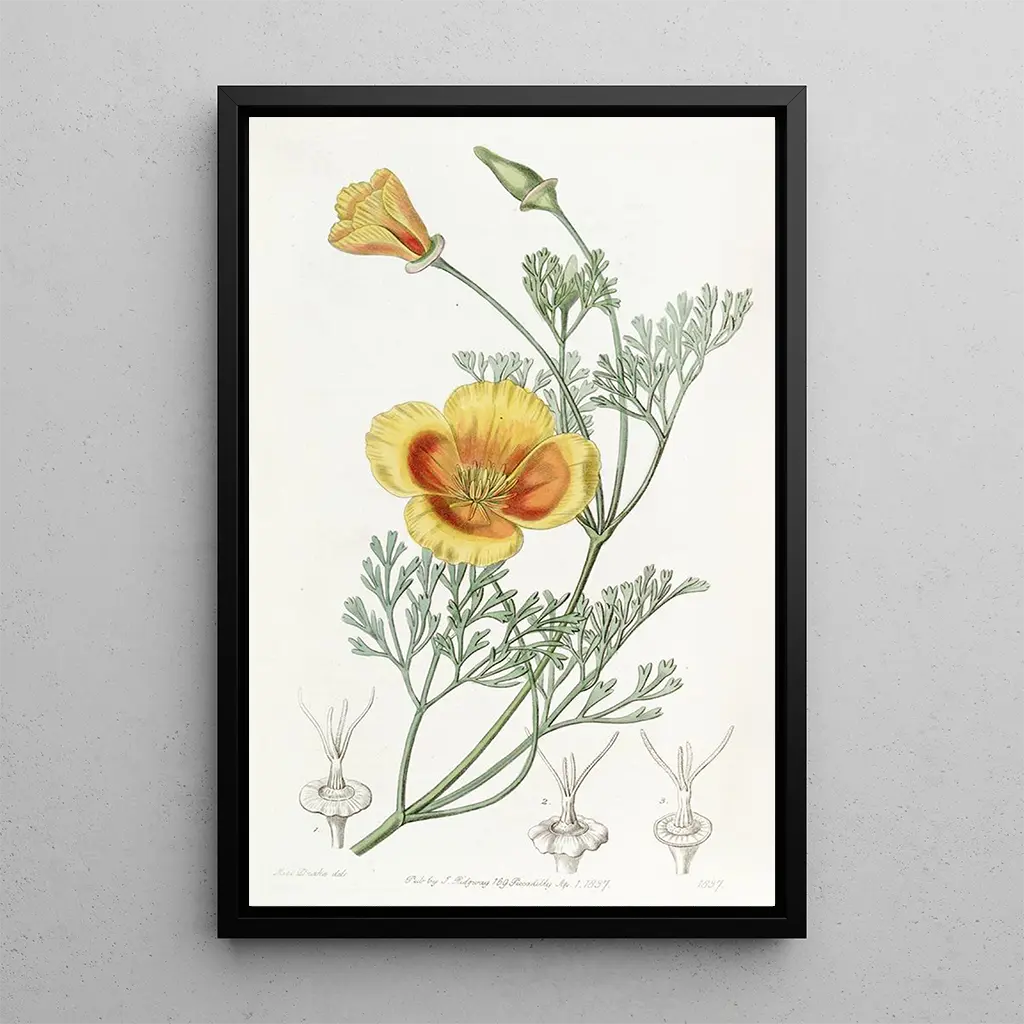 The art print of Chryseis dwarf, an iconic work by Sydenham Edwards, immerses us in a fascinating botanical universe. This canvas stands out with its vivid colors and meticulous details, highlighting the delicacy of this rare plant. The artist employs a watercolor technique that enhances the transparency of the leaves and the richness of the shades. The atmosphere emanating from this piece is both soothing and intriguing, inviting the viewer to explore the subtleties of nature. Each petal, each stem seems to tell a story, making this art print a true homage to biodiversity.