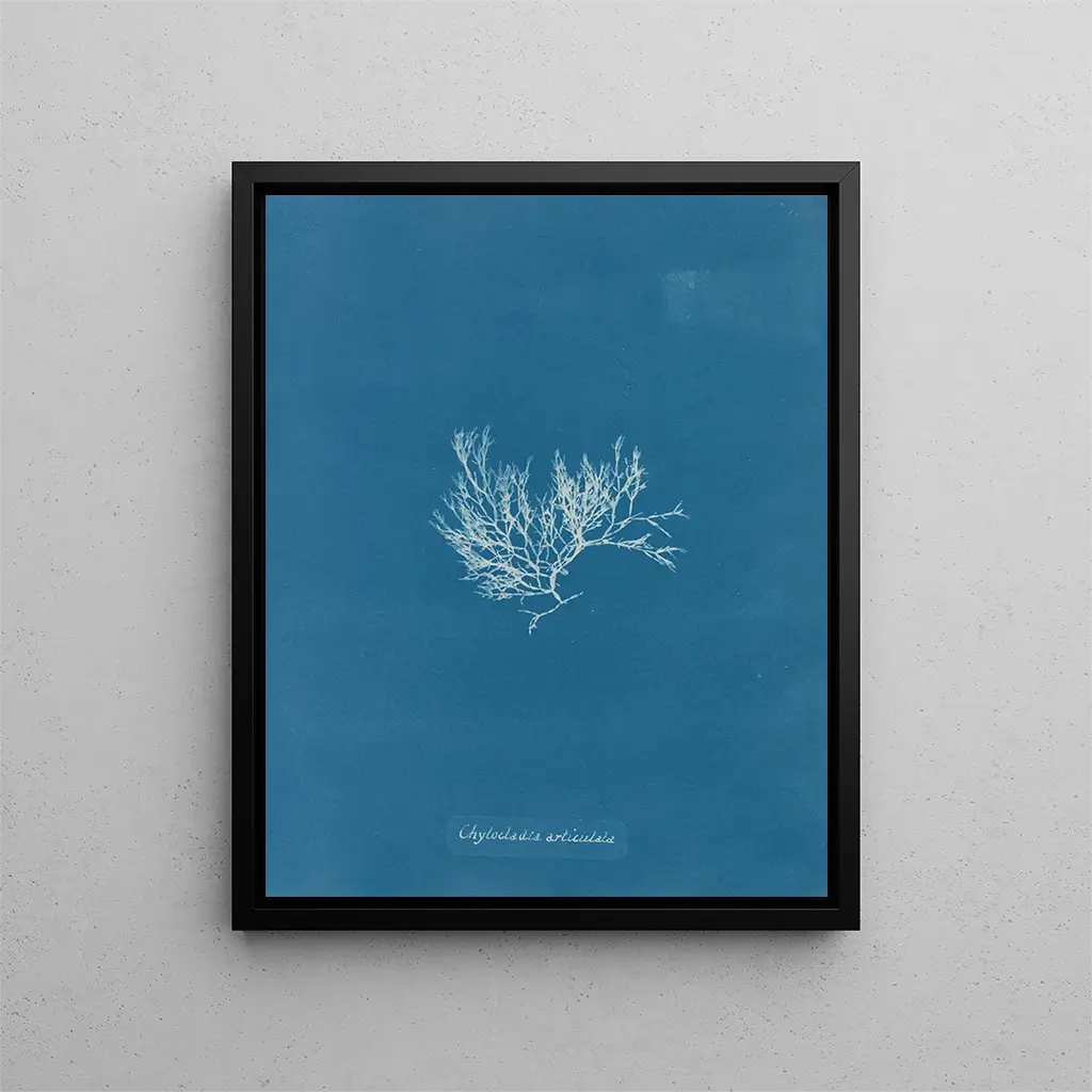 Reproduction Chylocladia articulé - Anna Atkins – Introduction captivante Dans le vaste univers de l'histoire de l'art, certaines œuvres se distinguent par leur capacité à capturer l'essence même de la nature. "Chylocladia articulé - Anna Atkins" en est un parfait exemple. Cette œuvre, réalisée par la pionnière de la photographie botanique, Anna Atkins, transcende le simple visuel pour offrir une expérience sensorielle et intellectuelle. En utilisant la technique du cyanotype, Atkins a su immortaliser la délicatesse des algues, révélant ainsi la beauté insoupçonnée de la flore marine. La reproduction de cette œuvre permet non seulement d'apprécier sa finesse, mais aussi de plonger dans l'univers fascinant de cette artiste avant-gardiste. Style et singularité de l’œuvre La singularité de "Chylocladia articulé" réside dans l'harmonie entre l'art et la science. Atkins, en tant que botaniste et photographe, a su allier ces deux disciplines avec une maîtrise remarquable. Le cyanotype, technique qu'elle a adoptée, confère à ses œuvres une profondeur et une texture uniques, où les nuances de bleu se mêlent aux formes délicates des algues. Chaque détail est mis en valeur, chaque ombre révèle une subtilité, transformant une simple représentation en une véritable œuvre d'art. La composition est soigneusement pensée, où l'espace négatif joue un rôle essentiel, permettant à l'œil de se poser sur les détails tout en offrant une respiration visuelle. Dans cette œuvre, la nature est célébrée dans toute sa splendeur, et l'on ressent une connexion presque spirituelle avec l'environnement marin. L’artiste et son influence Anna Atkins, souvent considérée comme la première femme photographe, a ouvert la voie à une nouvelle forme d'expression artistique. Née en 1799, elle a su s'imposer dans un milieu dominé par les hommes, utilisant la photographie pour documenter et explorer le monde naturel. Son travail a non seulement influencé ses contemporains, mais il continue d'inspirer des générations d'artistes et de scientifiques. À travers ses œuvres, Atkins a démontré que l'art pouvait servir de vecteur de connaissance, transformant l'observation scientifique en une expérience esthétique. Son approche novatrice a également contribué à l'émergence de la photographie comme forme d'art à part entière, établissant ainsi un dialogue entre la science et l'esthétique qui perdure jusqu