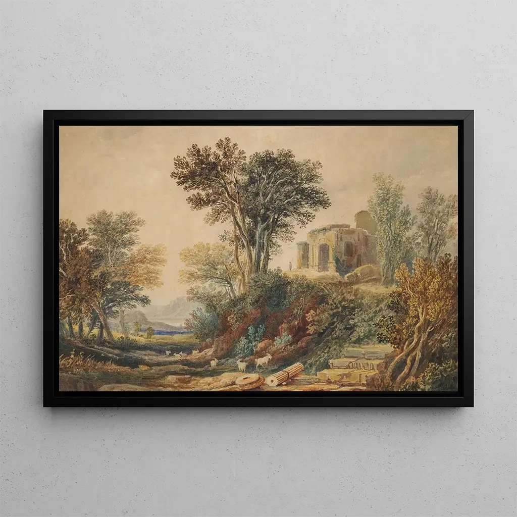This art print, titled "Classic landscape with ruins," evokes a scene filled with serenity and nostalgia. The soft colors and earthy tones create a peaceful atmosphere, while the majestic ruins suggest a glorious past. The composition, carefully balanced, guides the viewer's eye through the landscape, inviting exploration of every detail. Samuel Rostill Lines' technique, characterized by meticulous realism, allows you to feel the texture of natural and architectural elements. This art print is a true invitation to contemplation, where each glance reveals a new facet of this harmony between man and nature.