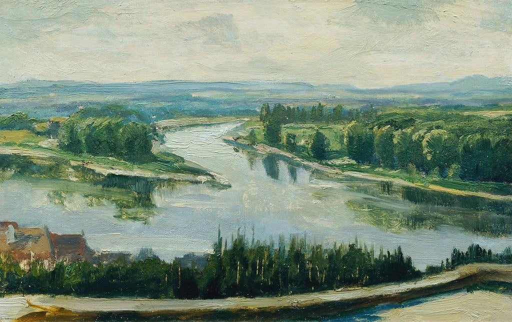 The canvas "Confluence of the Moldau and the Elbe" by Ferdinand Engelmüller immerses us in an idyllic landscape where rivers meet in a delicate dance. The soft colors and shades of green evoke the serenity of preserved nature, while the touches of blue in the rivers bring a refreshing vitality. The artist's technique, blending realism and impressionism, creates a peaceful, almost contemplative atmosphere. The meticulous details of the trees and hills invite us to explore every corner of this bucolic scene, where the sky is reflected in the calm waters, symbolizing harmony between man and his environment.