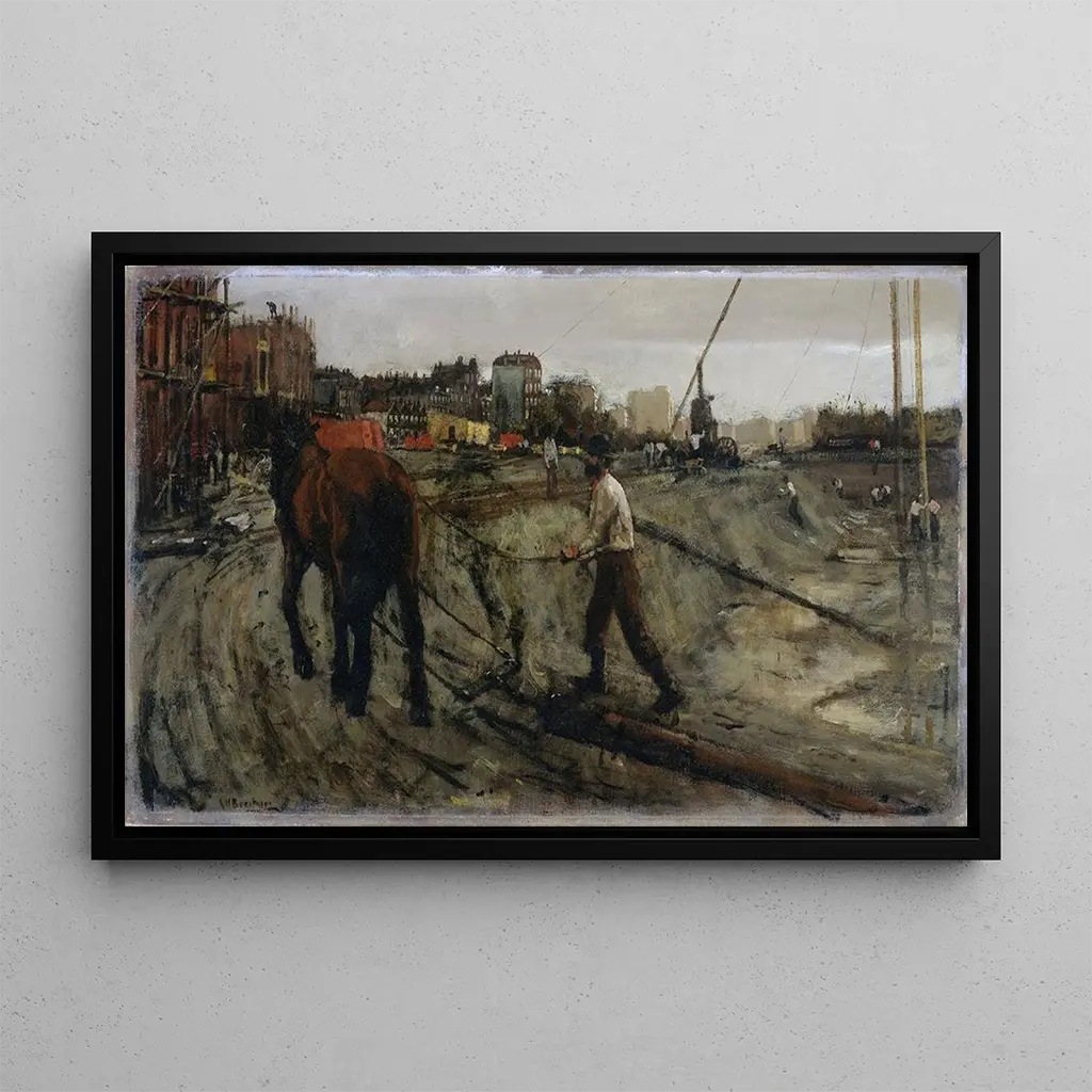The art print of "Construction Site" by George Hendrik Breitner immerses us in the hustle and bustle of a building site, capturing the energy and dynamism of the era. The earthy colors and play of shadows create an atmosphere that is both realistic and evocative. Breitner uses bold brushstrokes to depict workers at work, highlighting their determination and strength. This piece bears witness to a pivotal moment in the history of urbanization, where progress and industrialization shape the cityscape.