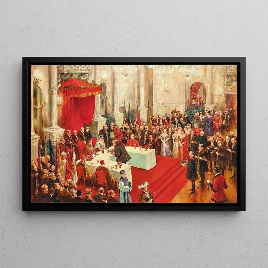 The art print of the "Coronation Banquet" is a decorative piece that will enhance any space, whether a living room, office, or bedroom. Its print quality and fidelity to the original details make it an ideal choice for art enthusiasts and history lovers. With its undeniable aesthetic appeal, this painting will add a touch of elegance and sophistication to your interior, while sparking conversations about royal traditions and significant historical events.