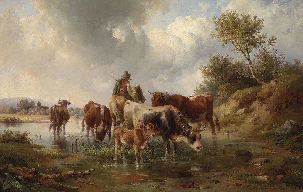 Cow with shepherds at the ford - Edmund Mahlknecht