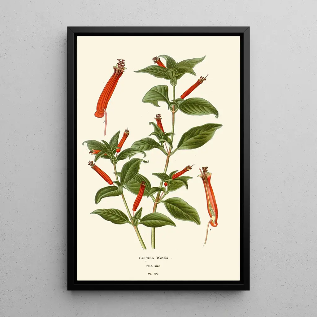 The art print of Cuphea ignea is an ideal decorative piece for various spaces such as the living room, office, or even the bedroom. Its vibrant color palette brings a touch of freshness and dynamism to your interior, while fostering a calming ambiance. The quality of the reproduction guarantees remarkable fidelity to the details of the original artwork, allowing you to fully appreciate the beauty of this plant. By choosing this canvas, you opt for a decorative element that not only enhances your space but also evokes a deep connection with nature.