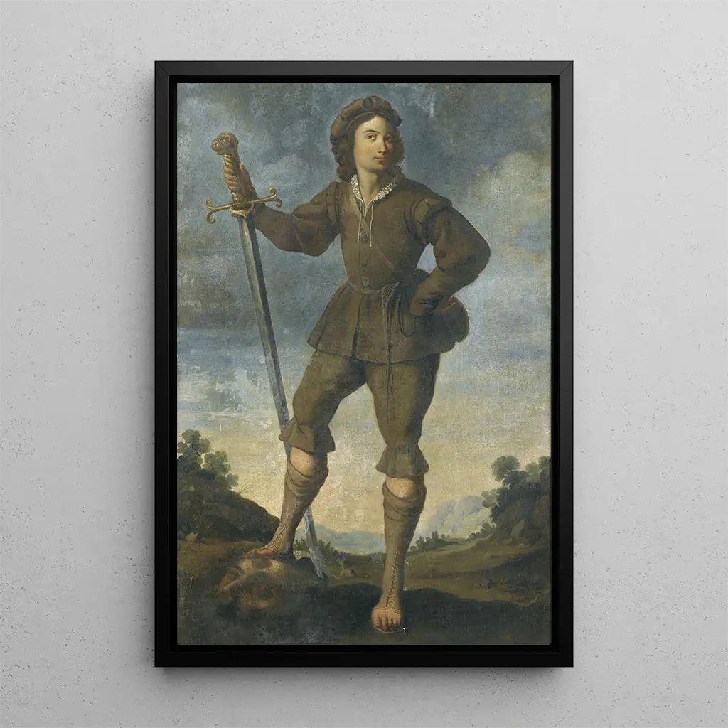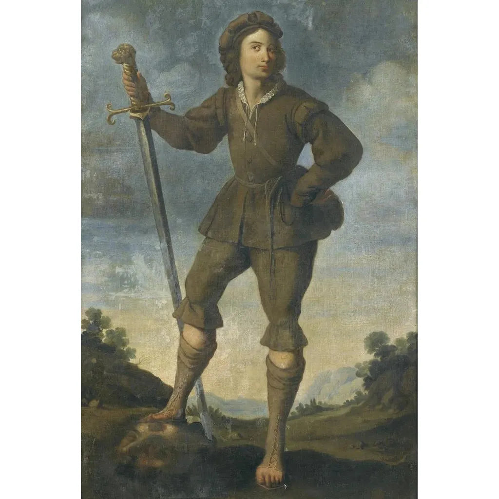 The painting David, created by Antonio del Castillo y Saavedra, captures the heroic essence of the biblical character through a dynamic composition and vibrant colors. David's posture, armed with his sling, exudes a calm strength, while the details of the drapery and facial expressions add emotional depth to the artwork. Light plays a crucial role, highlighting the contours of the body and creating a striking contrast with the background. This art print of David invites reflection on courage and faith, while offering a captivating visual experience.