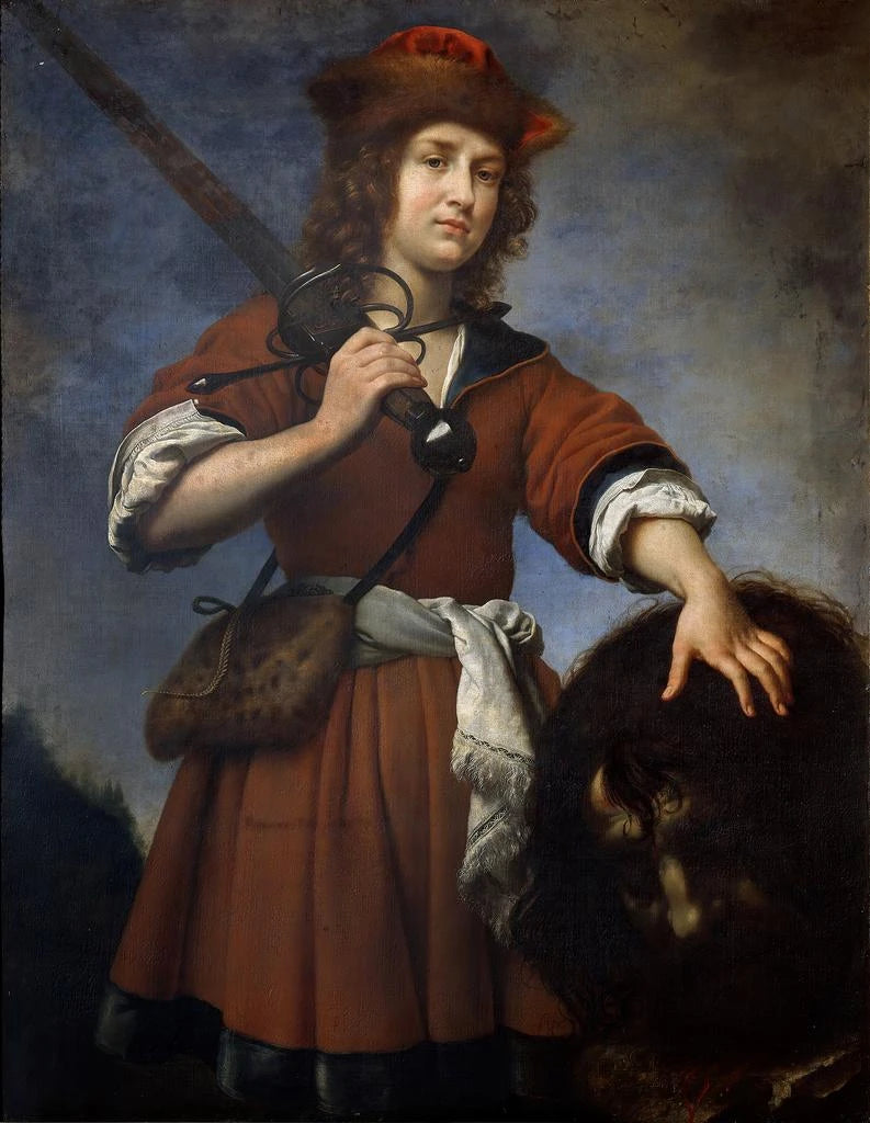 Art print of David with Goliath's head - Carlo Dolci – Captivating Introduction The "David with Goliath's head" artwork by Carlo Dolci, painted in the 17th century, embodies a moment of triumph and bravery, capturing the very essence of victory over adversity. This iconic representation of young shepherd David, holding the decapitated head of the giant Goliath, evokes a profound reflection on courage and faith. Through meticulous details and dramatic lighting, Dolci manages to convey an emotional intensity that transcends the simple biblical story. The scene, both powerful and touching, invites viewers to ponder universal themes of struggle and redemption. Style and uniqueness of the artwork Carlo Dolci's style is distinguished by its finesse and precision, characteristic of Italian Baroque painting. In "David with Goliath's head," every element is carefully crafted, from the textures of the clothing to the expressions on the face. Light plays a crucial role, highlighting David's features and creating a striking contrast with Goliath's shadow. This stylistic choice is not limited to realistic representation; it also evokes a spiritual dimension, where light symbolizes divine protection and inner strength. The color palette, rich and vibrant, enhances the visual impact of the composition while adding emotional depth to the artwork. Dolci's ability to capture David's moment of glory, while subtly suggesting reflection on the fragility of human life, demonstrates his artistic mastery. The artist and his influence Carlo Dolci, born in Florence in 1616, is often regarded as one of the masters of Italian Baroque painting. His work is marked by a constant pursuit of beauty and harmony, as well as a particular attention to detail that gives his paintings an almost spiritual dimension. Influenced by masters such as Caravaggio, Dolci developed a style that is uniquely his own, blending realism and idealization. His impact on the art of his time is undeniable, inspiring many artists across the centuries. The way he handles religious and mythological themes has also opened the