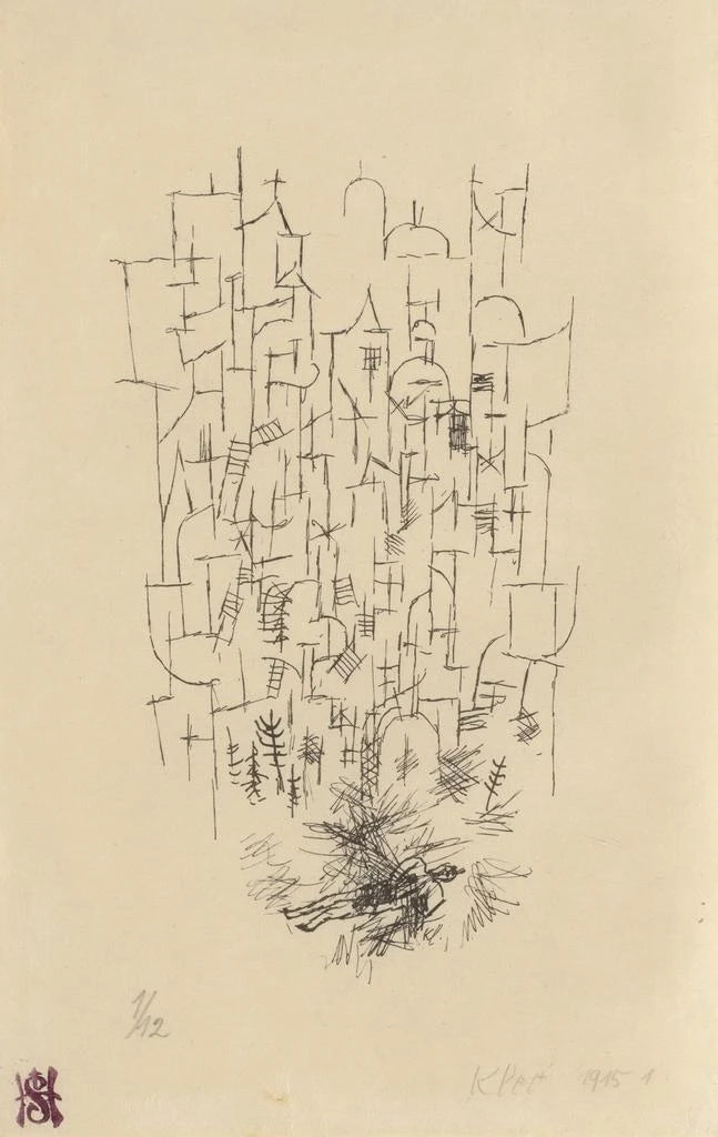 "The Death for the Idea" by Paul Klee is an art print that questions the duality of life and death through a bold composition. The abstract shapes and dark colors evoke an atmosphere of melancholy, while luminous elements emerge, symbolizing hope and creativity. Klee employs various techniques, blending watercolor and ink, to create a rich and complex texture. This canvas, both unsettling and fascinating, invites the viewer to reflect on themes of existence and transcendence, revealing the depth of Klee's artistic thought.