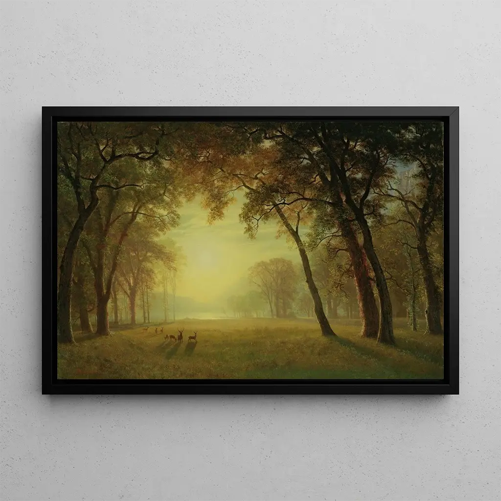 Yosemite Deer in a Clearing: a harmony between nature and serenity In "Yosemite Deer in a Clearing," Albert Bierstadt captures the majesty of American landscapes with striking delicacy. The canvas, bathed in golden light, depicts peacefully gathered deer in a lush clearing, surrounded by majestic mountains. The shades of green and brown evoke an atmosphere of tranquility, while the interplay of light and shadow adds an almost mystical depth to the scene. Bierstadt's technique, characterized by meticulous realism and attention to detail, invites the viewer to immerse themselves in this preserved nature, where each element seems to vibrate with its own life. Albert Bierstadt: a pioneer of American landscape art Active in the 19th century, Albert Bierstadt is one of the leading representatives of the artistic movement known as the Hudson River School. Influenced by his travels in Europe and his admiration for the grandiose landscapes of the American West, he was able to translate natural beauty into spectacular works of art. His paintings, often large in size, reflect a romantic and idealized vision of nature, demonstrating the growing importance of the environment in the American consciousness of his time. Bierstadt played a crucial role in promoting American landscapes, helping to shape national identity through art. A decorative acquisition with multiple advantages The art print of "Yosemite Deer in a Clearing" is an ideal choice to enhance your interior decor, whether in a living room, office, or bedroom. With its soothing palette and captivating subject, this piece adds a touch of nature and serenity to your space. The quality of the art print guarantees remarkable fidelity to the details of the original work, allowing you to enjoy Bierstadt's aesthetic appeal daily. By incorporating this canvas into your decor, you invite not only natural beauty into your home but also a piece of artistic history that will delight your guests.