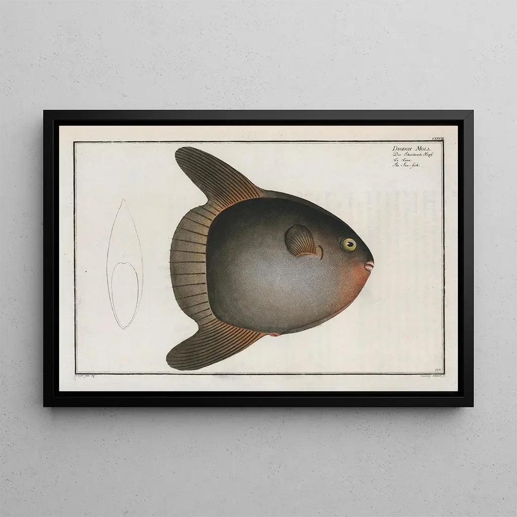 Diodon Mola, the sunfish: a giant of the seas in majesty The art print of Diodon Mola, the sunfish, transports us to the marine depths where this astonishing fish dwells. With its unique shape and gentle colors, this piece evokes the majesty and singularity of this ocean dweller. The illustration technique highlights the fascinating details of its skin and spines, creating an atmosphere that is both intriguing and soothing. This artwork invites you to discover an underwater world rich in diversity and beauty. Marcus Elieser Bloch: a master of zoological illustration Marcus Elieser Bloch, a naturalist and artist of the 18th century, is renowned for his significant contributions to the illustration of marine species. His works, which combine scientific precision and aesthetic appeal, testify to his commitment to documenting aquatic fauna. Influenced by the advances of his time, Bloch captured the very essence of marine creatures, making his illustrations not only informative but also visually captivating. His legacy endures, inspiring many artists and scientists. A decorative acquisition with multiple assets The art print of Diodon Mola is a decorative piece that will enrich your living space. Whether in a living room, office, or bedroom, this artwork adds a touch of originality and elegance. Its print quality and fidelity to the original colors make this canvas an ideal choice for nature and art enthusiasts. By incorporating this piece into your decor, you create an inspiring environment that celebrates the beauty and diversity of the oceans.