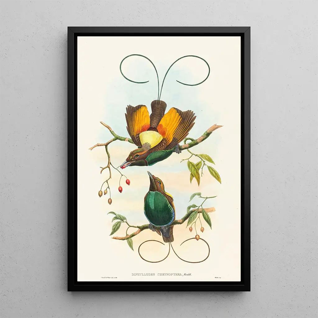 Diphyllodes chrysoptera: a dance of colors in nature The art print Diphyllodes chrysoptera, created by John Gould, immerses us in a vibrant universe where the dazzling hues of this butterfly's wings blend with the delicacy of nature. The turquoise and gold shades, carefully rendered, evoke an airy lightness, while the precision of the details highlights the ephemeral beauty of this insect. The lithography technique used by Gould allows for capturing not only the colors but also the very essence of the creature, thus offering an almost magical atmosphere. This artwork invites attentive contemplation, revealing the hidden splendor of the natural world. John Gould: a pioneer of ornithology and naturalism John Gould, a 19th-century British naturalist and ornithologist, marked his era with illustrations of unparalleled accuracy. Influenced by the scientific explorations of his time, he dedicated his life to the representation of birds and insects, thereby contributing to the knowledge of biodiversity. His works, including the art print Diphyllodes chrysoptera, demonstrate a realistic and detailed style, characteristic of the naturalist movement. Gould also collaborated with scientists and explorers, which enabled him to access rare specimens and immortalize them through his art, leaving a lasting legacy in the field of scientific illustration. A decorative acquisition with multiple advantages The reproduction of the painting Diphyllodes chrysoptera proves to be an ideal decorative choice for various spaces, whether in a living room, office, or bedroom. Its print quality and fidelity to the original colors make it a captivating art piece that draws the eye and inspires admiration. By integrating this canvas into your interior decor, you add a touch of elegance and nature, while enriching your environment with an art print that tells a story. The aesthetic appeal of this reproduction makes it a conversation piece, creating a serene and inspiring atmosphere.