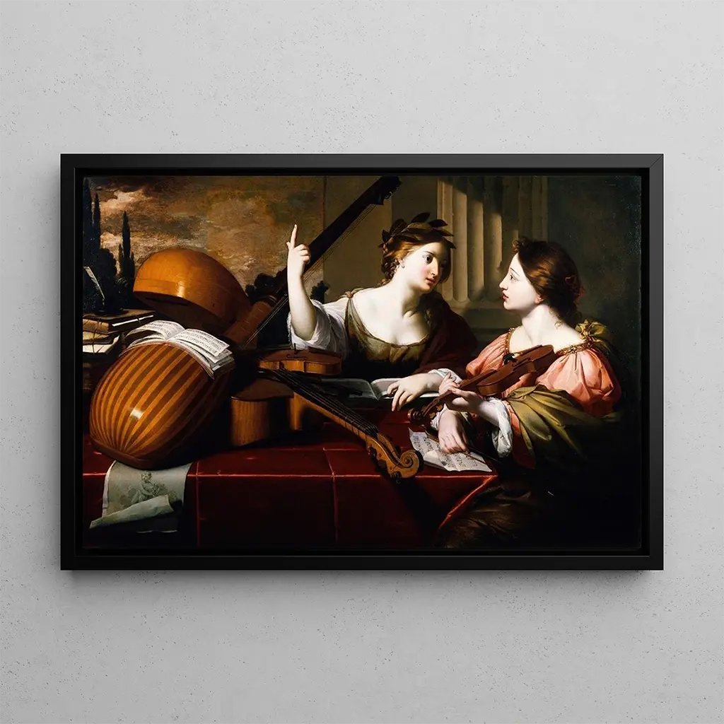 "Inspiration divine de la musique" by Nicolas Régnier is a work that evokes the beauty and depth of musical art through a composition rich in symbolism. The canvas depicts allegorical figures surrounded by musical instruments, creating an atmosphere of enchantment and serenity. The warm, golden colors, combined with subtle plays of light, reinforce the idea of transcendent inspiration. Every detail, from the expressions of the characters to the textures of the drapery, demonstrates technical mastery that invites contemplation and escape.