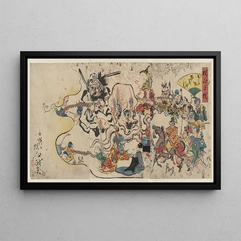 Kawanabe Kyōsai, active during the second half of the 19th century, is one of the last great masters of ukiyo-e, a style of Japanese printmaking that reached its peak during the Edo era. Influenced by the artistic traditions of his time, he managed to incorporate elements of Western culture while preserving the essence of Japanese art. His career was marked by a desire for experimentation and innovation, which allowed him to stand out in a rapidly changing artistic environment. His works, such as the Dke Hyakumanben art print, demonstrate his skill in capturing life in all its forms, making him an essential figure in the history of Japanese art.