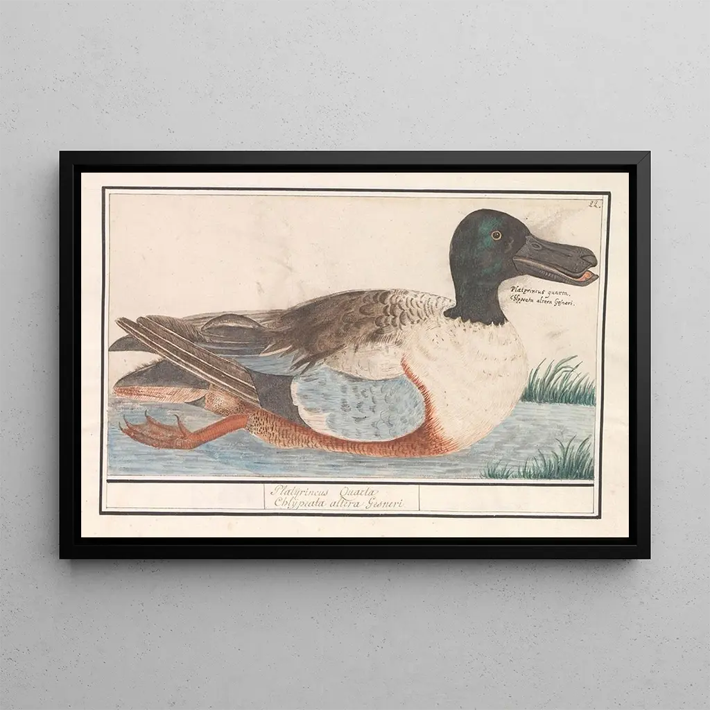 The art print of the "Canard souchet Anas clypeata" by Anselmus Botius de Boodt is a true homage to ornithological beauty. This painting, rich in detail, captures the elegance of this duck with its distinctive plumage. The delicate shades of green and brown blend harmoniously, while the aquatic background evokes a peaceful natural environment. The precision of the lines and the finesse of the textures create a lively, almost tangible atmosphere, inviting the viewer to admire the grace of this bird. This piece is a perfect example of how art can celebrate wildlife and flora.