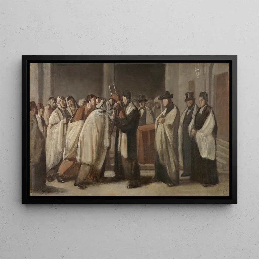 La reproduction du Service du sabbat d'Édouard Moyse illustre avec délicatesse une scène intime et spirituelle. Les couleurs riches et les détails minutieux plongent le spectateur dans l'atmosphère sacrée de cette célébration. Les personnages, vêtus de costumes traditionnels, sont représentés avec une grande expressivité, reflétant la profondeur des rituels juifs. La lumière douce qui émane de la scène crée une ambiance chaleureuse, invitant à la réflexion sur la spiritualité et la communauté, éléments essentiels de cette pratique ancestrale.