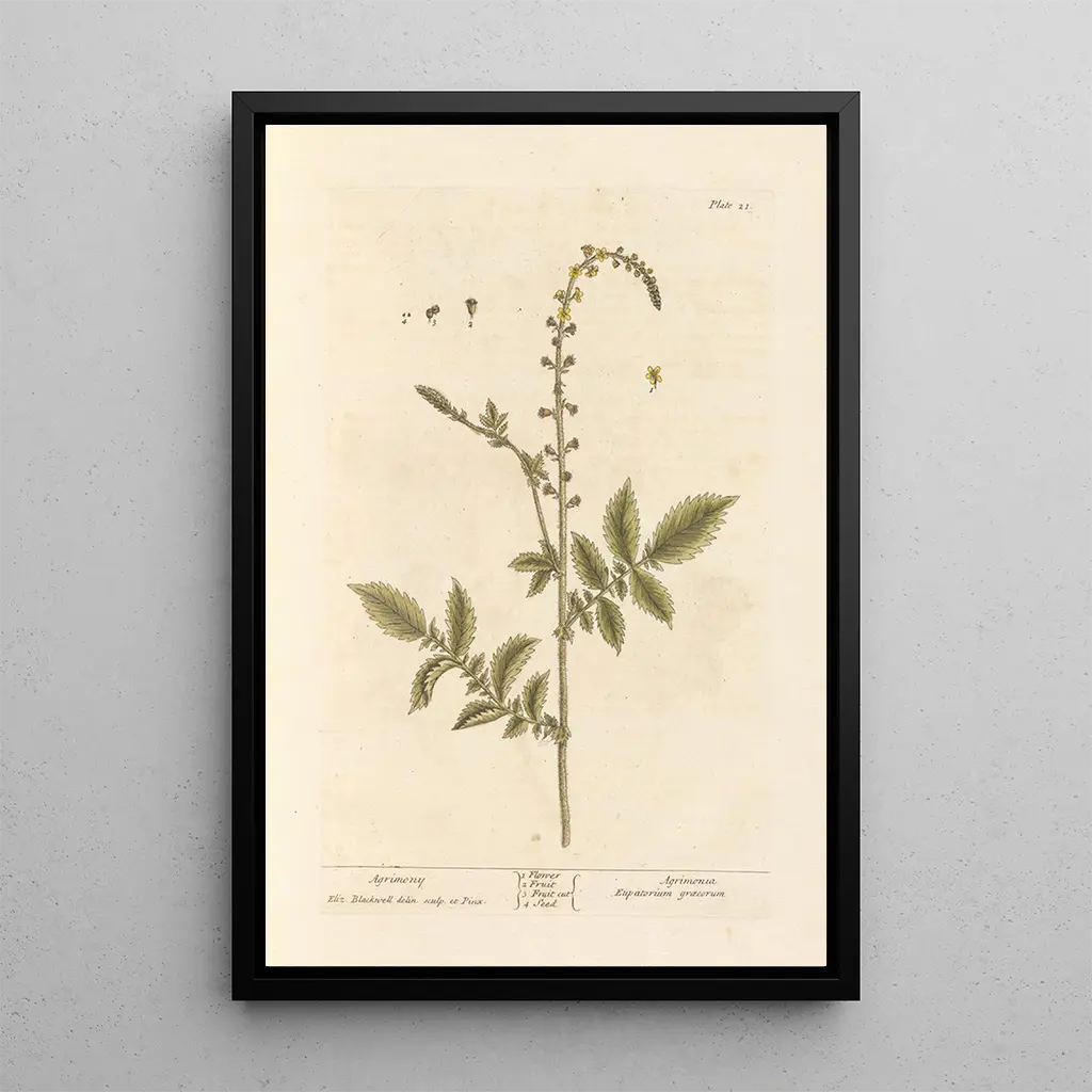 L'art print "Aigremoine" d'Elizabeth Blackwell est une illustration captivante qui met en lumière cette plante aux fleurs dorées. Avec des détails précis et une palette de couleurs éclatantes, Blackwell réussit à transmettre la grâce et la légèreté de l'aigremoine. Les tiges élancées et les petites fleurs en grappes créent une composition harmonieuse, évoquant une atmosphère de fraîcheur et de vitalité. Cette toile, à la fois artistique et scientifique, invite à explorer les merveilles de la nature tout en célébrant la beauté des plantes médicinales.