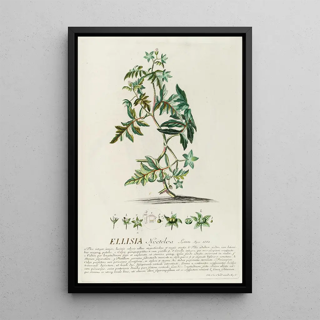Ellisia : a dance of colors and shapes "Ellisia" by Georg Dionysius Ehret is an art print that evokes the lightness and grace of flowers. In this artwork, vibrant colors blend harmoniously, creating a lively tableau that seems to vibrate under the light. The delicate watercolor technique allows each detail to be fully expressed, from the contours of the petals to the subtle nuances of the leaves. The atmosphere emanating from this piece is both joyful and soothing, inviting the viewer to immerse themselves in a floral world where every element tells a story. The balanced and dynamic composition captures the eye and imagination, making "Ellisia" a captivating art print. Georg Dionysius Ehret: a master of artistic botany Georg Dionysius Ehret, active in the 18th century, is often regarded as one of the pioneers of botanical illustration. Influenced by the naturalist movement, he skillfully combined art and science in his works, creating illustrations of remarkable precision. His travels across Europe and collaborations with renowned botanists enriched his artistic approach, allowing him to capture the beauty of plants with unparalleled meticulousness. Ehret left a lasting legacy in the worlds of art and botany, inspiring many artists to explore nature through their own lens. A decorative acquisition with multiple advantages The art print "Ellisia" is an ideal decorative piece to enhance your interior, whether in a living room, office, or bedroom. Its exceptional print quality and fidelity to the original details make it a perfect choice for art and nature enthusiasts. This "Ellisia" art print adds a touch of freshness and color to your decor, while also impressing your guests. With its undeniable aesthetic appeal, this canvas is much more than a simple decorative element; it is an invitation to celebrate the beauty of nature in everyday life.