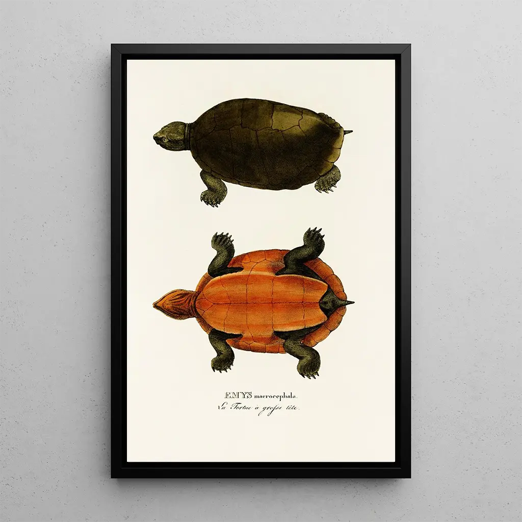 Emys Maerocephala: a tribute to natural beauty The art print of Emys Maerocephala, created by Johann Baptist von Spix, immerses us in a universe where the delicacy of forms and the richness of colors converge. This painting, depicting a turtle with a shell adorned with subtle patterns, evokes a peaceful and contemplative atmosphere. The shades of green and brown, combined with touches of light, create a play of shadow and illumination that highlights the texture of the animal's skin. The watercolor technique, executed with mastery, gives the artwork a lightness and fluidity that captivate the eye and invite wonder. Johann Baptist von Spix: a pioneer of naturalist observation Johann Baptist von Spix, a 19th-century naturalist and explorer, played a vital role in the study of Brazilian fauna and flora. His work, marked by a rigorous scientific approach, contributed to expanding knowledge of biodiversity at the time. Influenced by Romanticism, he skillfully combined precision and aesthetics in his works. Emys Maerocephala, the result of his observations, bears witness to his commitment to nature and his desire to share its beauty with the world. This art print fits into a period where art and science intersect, illustrating the importance of faithful species representation. A decorative acquisition with multiple advantages The art print of Emys Maerocephala is an ideal choice to enhance your interior, whether in a living room, office, or bedroom. Its print quality and fidelity to the original details make it a decorative art piece that catches the eye and sparks conversations. Its aesthetic appeal, combined with its message about nature preservation, makes it a meaningful addition to any collection. By integrating this canvas into your space, you bring a touch of elegance and serenity, while celebrating the beauty of the animal world.