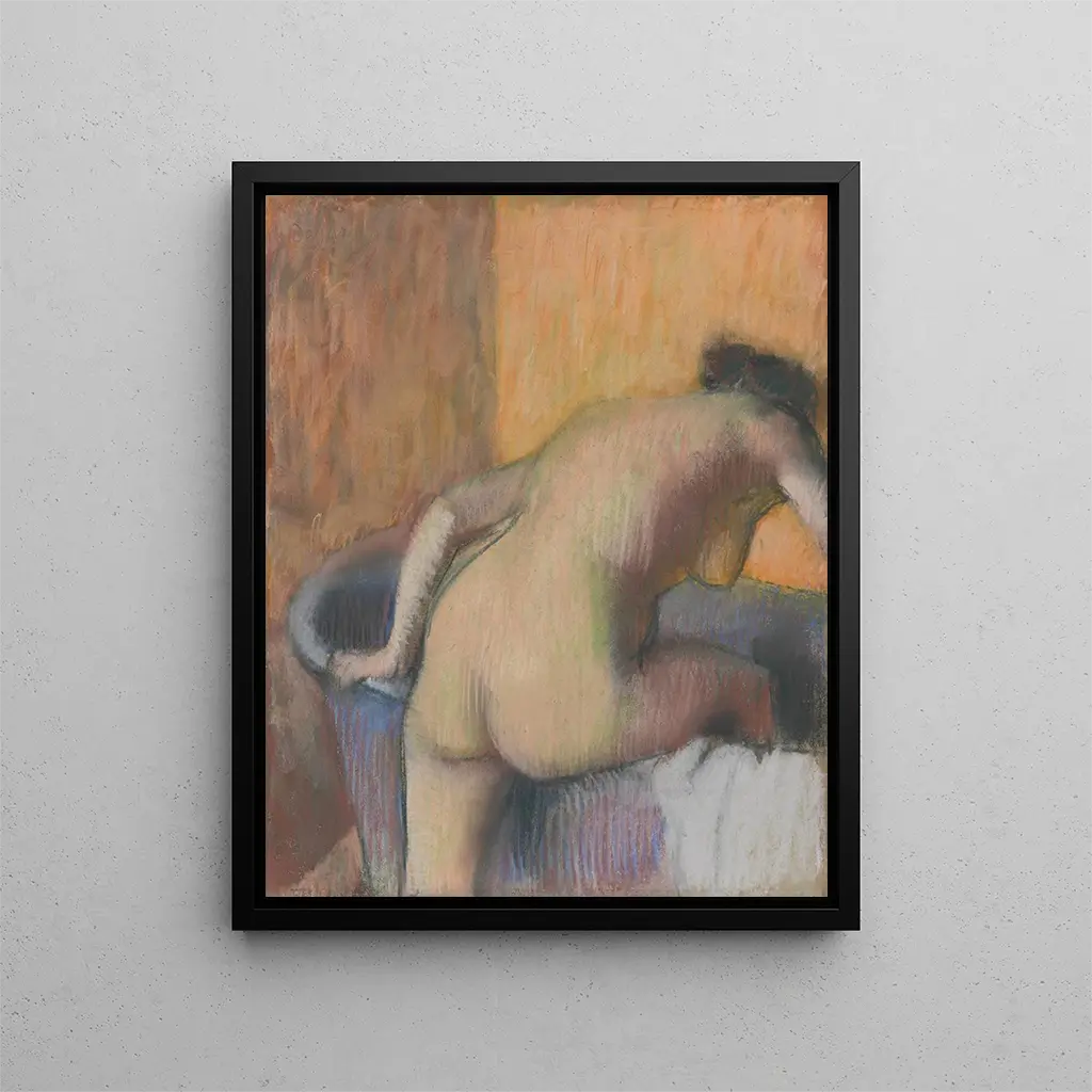 Degas's style in "Baigneur entrant dans une baignoire" is characterized by a bold approach to composition and color. The artist uses flowing lines and organic shapes to bring his subject to life, while playing with shadows and highlights to create striking depth. The color palette, dominated by soft and soothing tones, evokes an ambiance of serenity, while the quick, expressive brushstrokes testify to the spontaneity of the moment. True to his interest in movement, Degas captures the precise moment when the woman leans in to enter the bathtub, immortalizing a simple gesture loaded with meaning. This artwork is a true ode to the beauty of everyday life, revealing the poetry hidden in the most ordinary gestures.