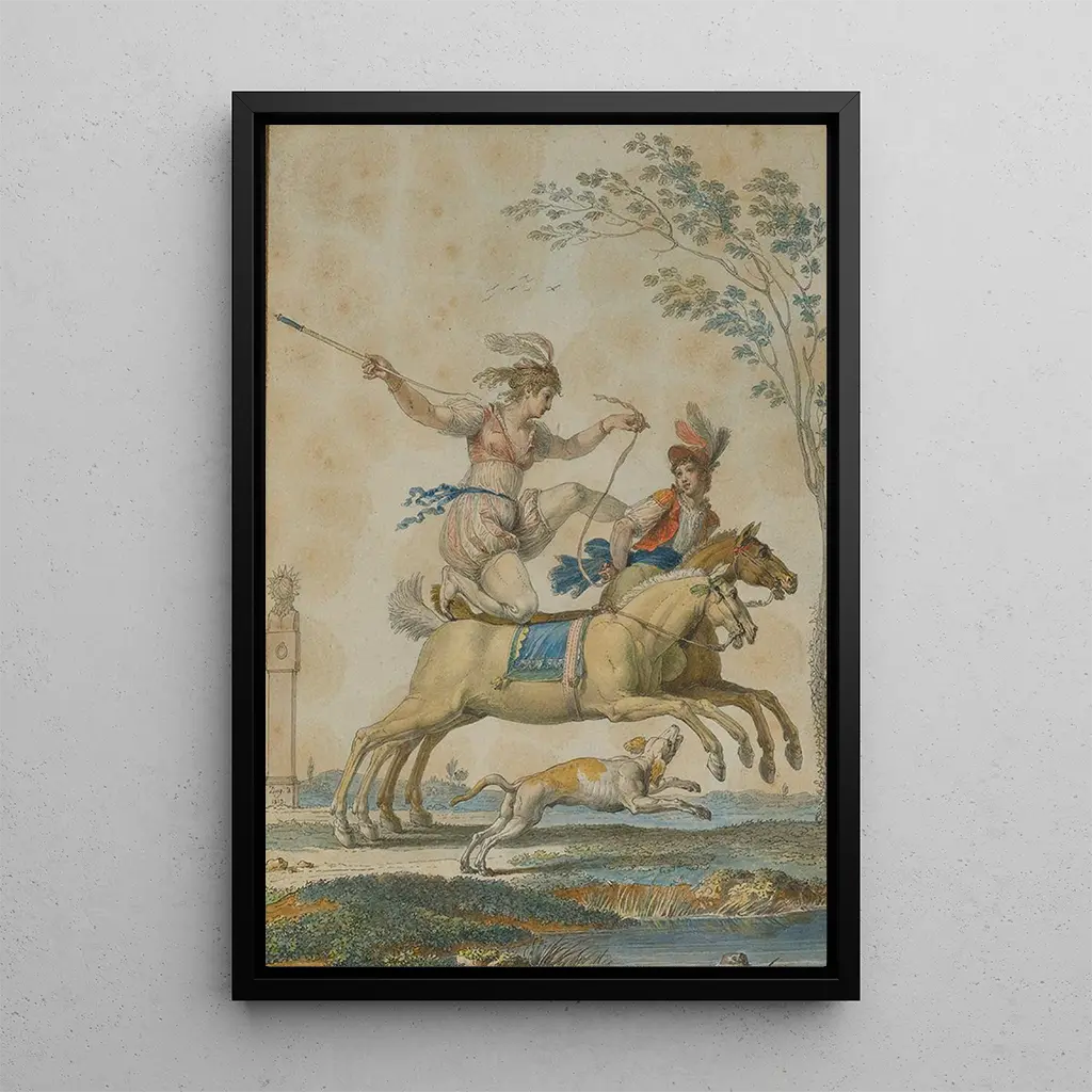 Acrobats on horseback: a dazzling dance of grace and movement The art print "Acrobats on horseback" by Jean Démosthène Dugourc captures the very essence of agility and beauty. The figures in mid-air, intertwined in an aerial choreography, are rendered with remarkable precision. The vibrant and dynamic colors, ranging from bright reds to deep blues, breathe life into the scene. The artist's technique, skillfully blending drawing and painting, creates an atmosphere of lightness and excitement, transporting the viewer to a world where balance and strength meet. Every detail, from the focused expressions of the acrobats to the fluid movements of the horses, demonstrates impressive technical mastery. Jean Démosthène Dugourc: a witness to neoclassical art Jean Démosthène Dugourc, active at the end of the 18th century, is an emblematic artist of the neoclassical movement. Influenced by the great masters of his time, he specialized in genre scenes and representations of everyday life, while incorporating elements of classical culture. His work, often imbued with dynamism and movement, reflects the ideals of beauty and harmony of his era. Dugourc was able to capture the spirit of his time, where art was both a celebration of the human form and an exploration of themes of virtuosity and excellence. A decorative acquisition with multiple assets The art print "Acrobats on horseback" is a decorative piece that will enhance any space, whether a living room, office, or bedroom. Its print quality and color fidelity make it an ideal choice for those wishing to add a touch of elegance and dynamism to their interior. This artwork, with its undeniable aesthetic appeal, draws the eye and inspires admiration. By choosing this canvas, you opt for a piece that not only beautifies your decor but also evokes the passion and energy of equestrian performances, creating a lively and inspiring atmosphere.