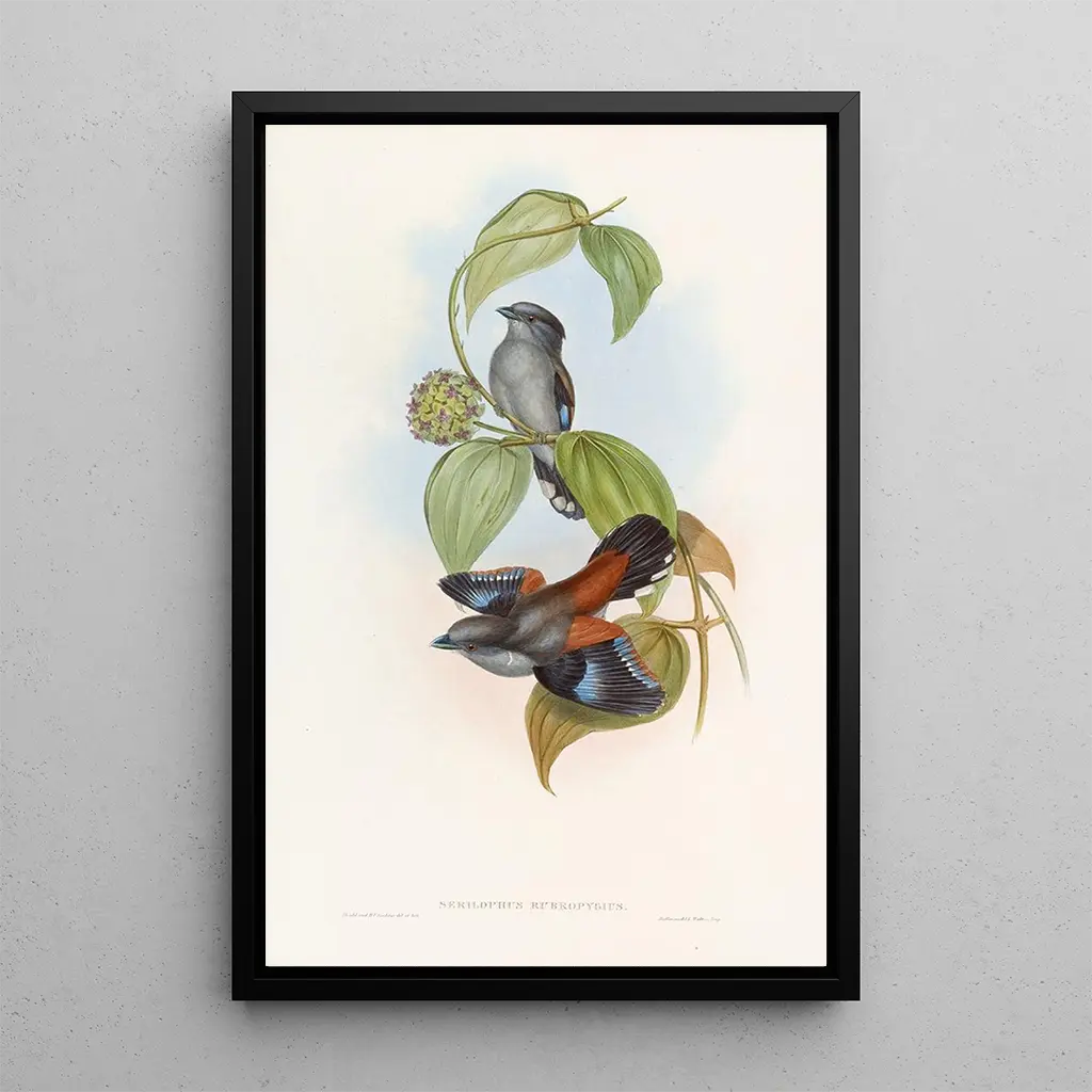 The Eurylaime with Red Back, with its flamboyant plumage, evokes a journey into the heart of lush forests. This vibrant art print, created by John Gould, captures the very essence of this exotic bird, highlighting fiery red hues and bright shades of green. Gould's ornithological technique is distinguished by its attention to detail, with each feather rendered with remarkable precision. The atmosphere of the piece invites wonder, as if one could hear the melodious song of this bird in its natural habitat.