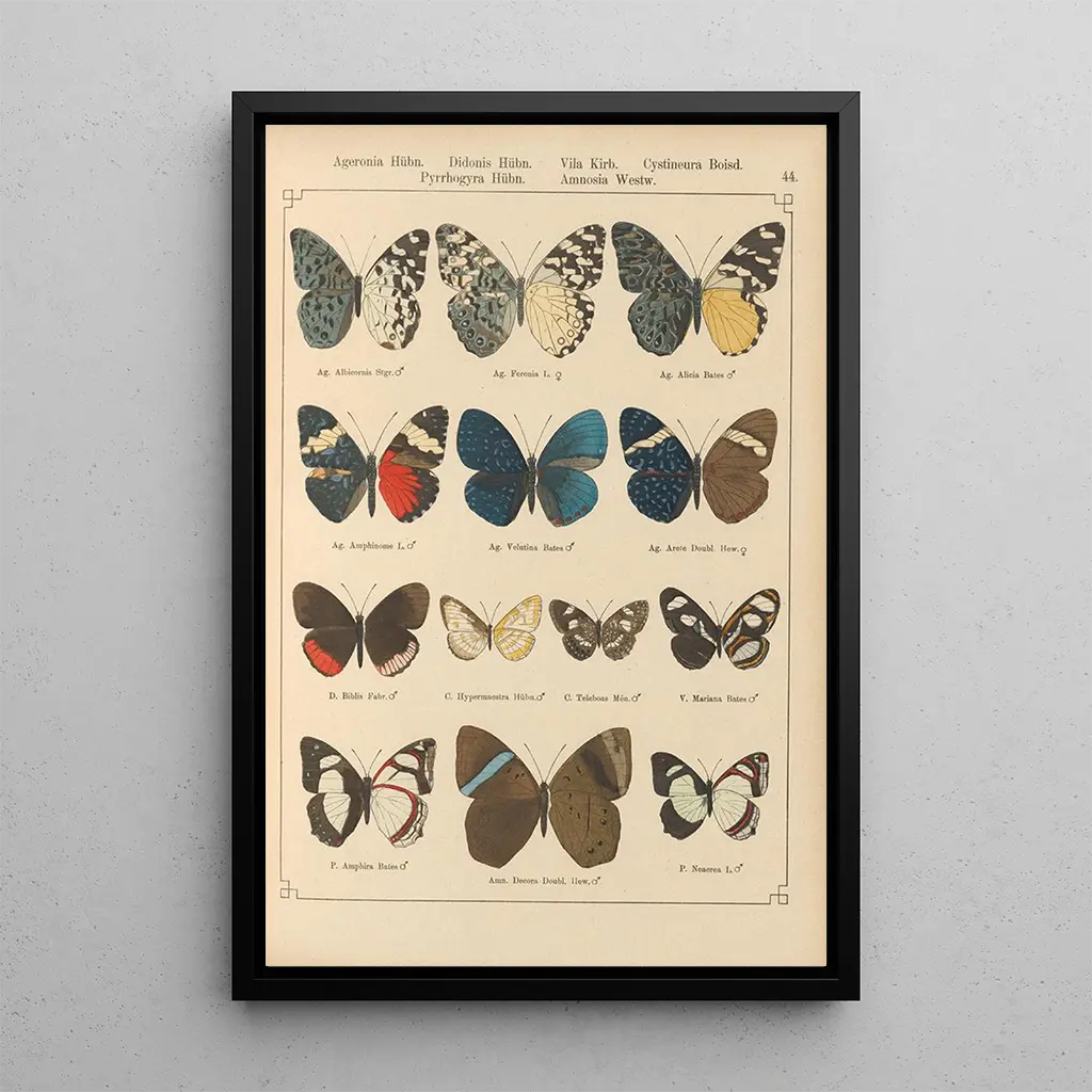 The art print of the work "Papillons exotiques Pl044" by Otto Staudinger immerses us in a lively universe where nature expresses itself with brilliance. The shimmering colors of the butterfly wings, ranging from deep blues to bright yellows, create an atmosphere of lightness and dreaminess. The watercolor technique, used with finesse, captures the delicacy of the patterns and textures, making the wings almost vibrate under the light. Every detail is carefully observed, inviting the viewer to an attentive and wondrous contemplation of the ephemeral beauty of these creatures.