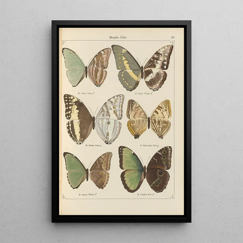 The art print of "Papillons exotiques Pl069" by Otto Staudinger is a true ode to the beauty of nature. The vibrant colors of the butterfly wings, ranging from dazzling blues to golden yellows, blend harmoniously to create an atmosphere that is both joyful and soothing. The watercolor technique, used with finesse, brings each detail to life, from the delicate veins of the wings to the subtle shadows surrounding them. This art print invites attentive contemplation, where each glance reveals a new nuance and a new emotion, as if the butterflies are about to take flight beyond the canvas.