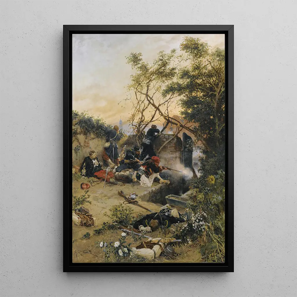 Dans la reproduction d'Essuyant le feu, Alphonse Marie de Neuville dépeint une scène poignante de courage et de résilience. Le tableau illustre des soldats en pleine action, faisant face à des défis extrêmes avec une intensité palpable. Les couleurs sombres et les contrastes marqués accentuent l'atmosphère dramatique de l'œuvre. La technique de l'artiste, mêlant réalisme et expressivité, permet de ressentir la tension et l'urgence de la situation. Chaque détail, des visages déterminés aux mouvements dynamiques, contribue à créer une narration visuelle captivante qui transporte le spectateur au cœur de l'action.