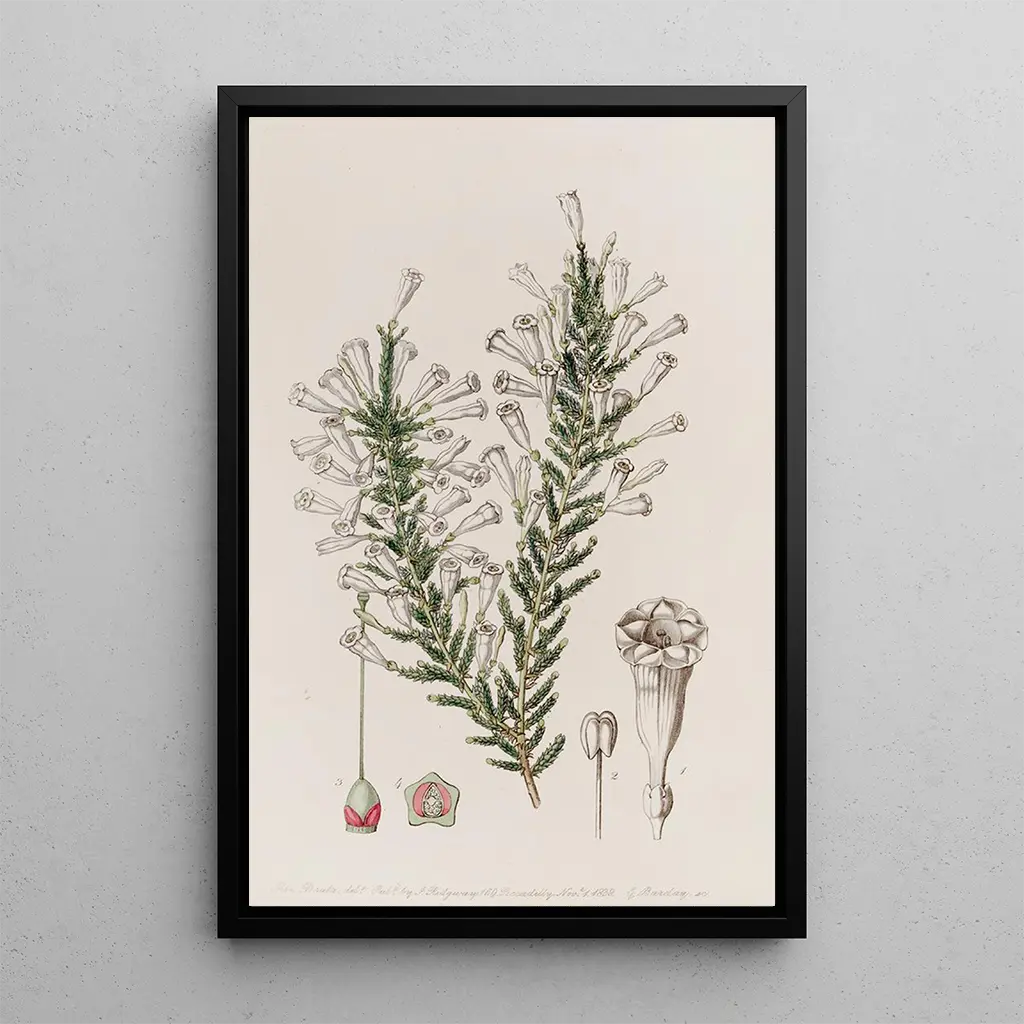 The art print Fabiana Imbriquée by Sydenham Edwards is a piece that evokes the delicacy and richness of nature. The vibrant shades of green and pink intertwine to create a harmonious composition, where every detail seems to come to life. The watercolor technique, skillfully applied, adds a sense of lightness to the overall piece, while the precise outlines of the flowers highlight their ephemeral beauty. This canvas invites contemplation, transporting the viewer to a lush garden where flora flourishes in all its splendor.
