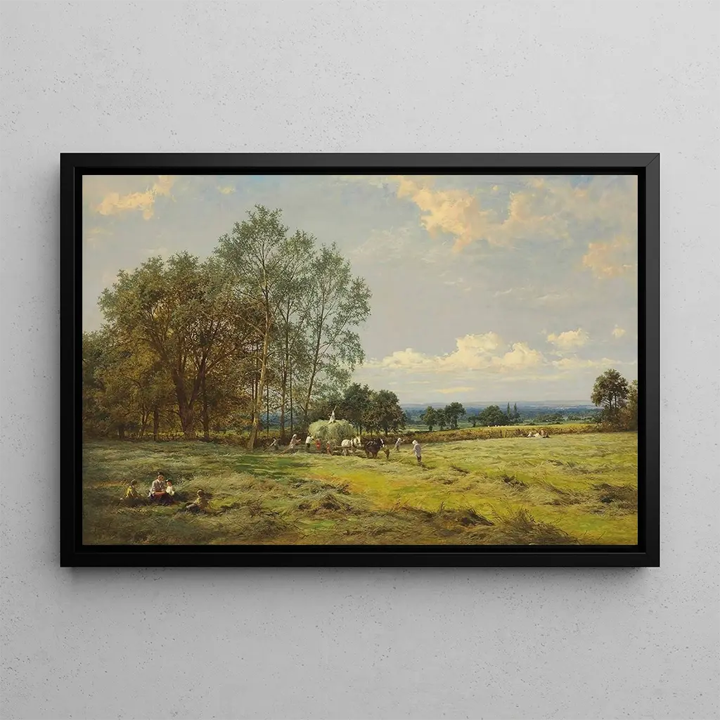 "Faneurs" by Benjamin Williams Leader is an art print that celebrates rural life and the beauty of English landscapes. The canvas depicts peasants at work, surrounded by golden fields and a bright blue sky. The vibrant colors and play of light capture the essence of a sunny day, creating an atmosphere of joy and serenity. Leader's technique, marked by dynamic brushstrokes, brings life to each character and the surrounding nature. This art print of the painting "Faneurs" invites immersion into a pastoral world where work and nature harmonize.
