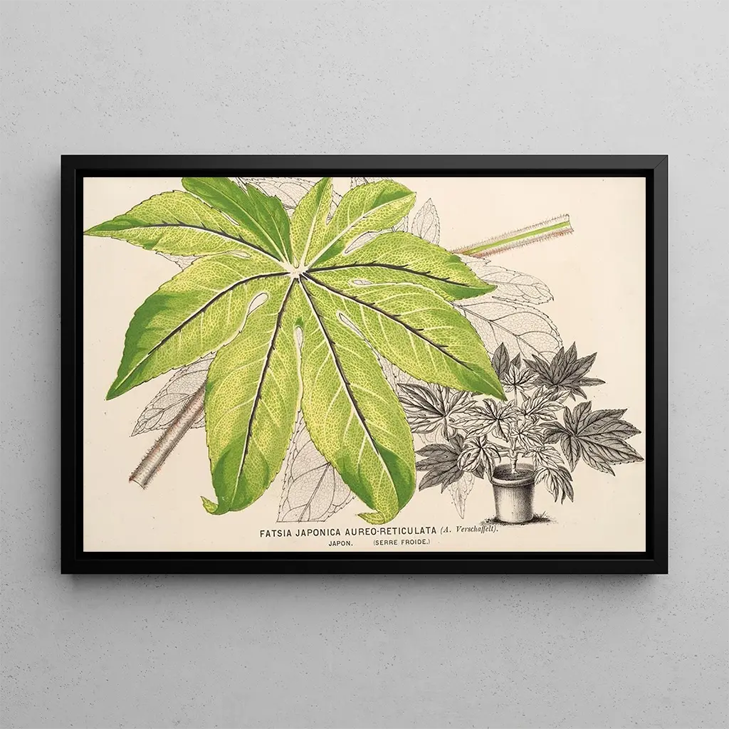Fatsia japonica aureoreticulata: a dance of light and greenery The art print of Fatsia japonica aureoreticulata immerses us in a fascinating botanical universe, where broad, intricately cut leaves intertwine in a harmony of vibrant greens. The golden hues punctuating the leaf veins add a luminous dimension, evoking sunbeams filtering through lush foliage. This piece, both realistic and poetic, captures the very essence of nature, inviting contemplation and serenity. The artist's technique, playing with light and shadow, creates a soothing atmosphere, ideal for enhancing a living space. Charles Antoine Lemaire: a pioneer of artistic horticulture Charles Antoine Lemaire, a 19th-century botanist and artist, masterfully combined science and art in his works. Influenced by the naturalist movements of his time, he dedicated his career to the study and depiction of exotic plants. Lemaire traveled around the world, collecting rare specimens and immortalizing them through his illustrations. His contribution to horticulture and botany is invaluable, and his works, like this art print, testify to his commitment to the beauty of nature and his desire to share it with the public. A decorative acquisition with multiple advantages Choosing an art print of the Fatsia japonica aureoreticulata painting means selecting a decorative element that will bring a touch of greenery and freshness to your interior. Whether in a living room, office, or bedroom, this canvas integrates harmoniously into various decorating styles, from contemporary to classic. Its printing quality guarantees color fidelity and detail, while its aesthetic appeal is sure to pique the interest and curiosity of your guests. By adding this piece to your collection, you create a space where nature and art meet.