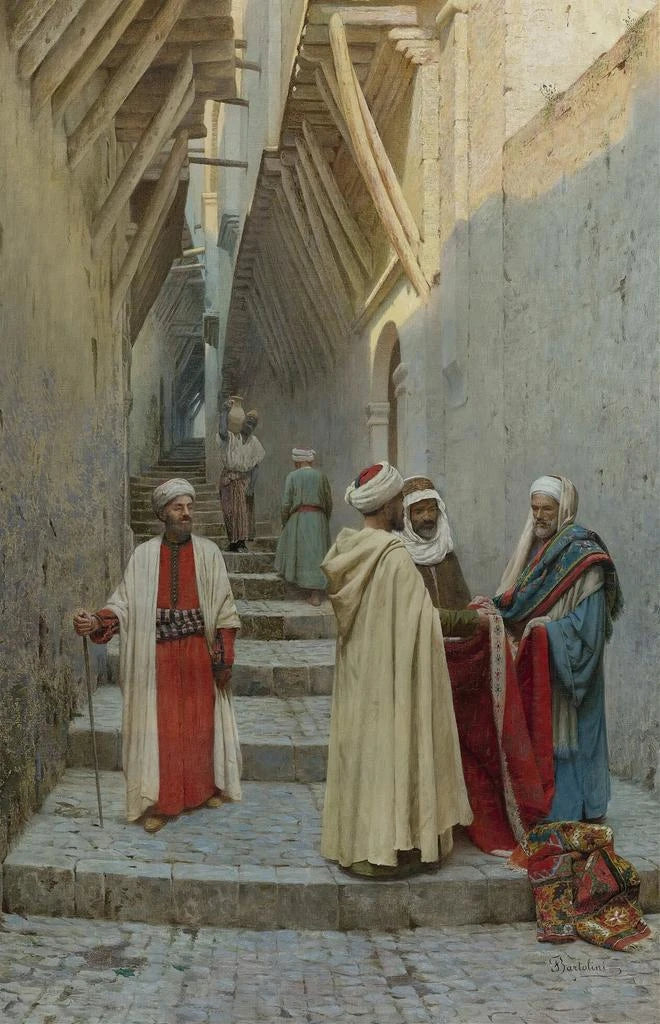 19th-century artist Federico Bartolini distinguished himself by his ability to immortalize moments of everyday life with a unique sensitivity. Influenced by the artistic movements of his time, he skillfully integrated elements of realism and romanticism into his works. Bartolini often explored themes of craftsmanship and cultural traditions, highlighting human interactions in various contexts. His work, notably "Marchand de tapis," illustrates the importance of trade and craftsmanship in Italian society, while celebrating the beauty of cultural exchanges.