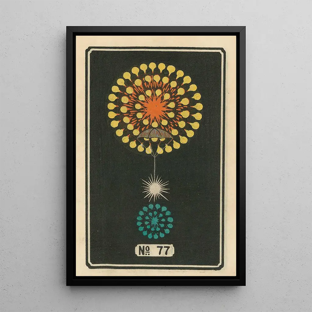Night Fireworks No. 77: A Luminous Dance in the Sky In this art print of Night Fireworks No. 77, Jinta Hirayama captures the fleeting brilliance of fireworks illuminating the night. The vivid and dazzling colors, ranging from fiery reds to deep blues, create a festive and enchanting atmosphere. The artist's technique, blending watercolor and ink, brings each explosion of light to life, making the energy of the event almost tangible. You can almost hear the crackling of the rockets and feel the excitement of the spectators, immersed in a moment of pure magic. Jinta Hirayama: a master of Japanese tradition Jinta Hirayama, a Japanese artist of the 20th century, is renowned for his ability to merge tradition and modernity in his works. Influenced by ukiyo-e prints, he reinvented this style by incorporating contemporary elements. Hirayama dedicated his career to exploring themes of nature and Japanese festivities, notably fireworks, which symbolize joy and ephemerality. His work is a testament to the importance of Japanese culture in art, while engaging in a dialogue with the international artistic movements of his time. A decorative acquisition with multiple assets The art print of Night Fireworks No. 77 is an ideal choice to enhance your interior, whether in a living room, office, or bedroom. Its print quality faithfully reproduces the original colors and its aesthetic appeal makes it a captivating piece that draws the eye. By adding this canvas to your decor, you bring a touch of elegance and dynamism, while celebrating the beauty of Japanese traditions. This artwork is sure to spark conversations and bring a festive atmosphere to your living space.