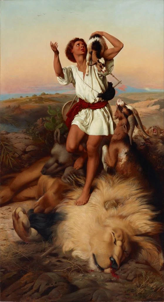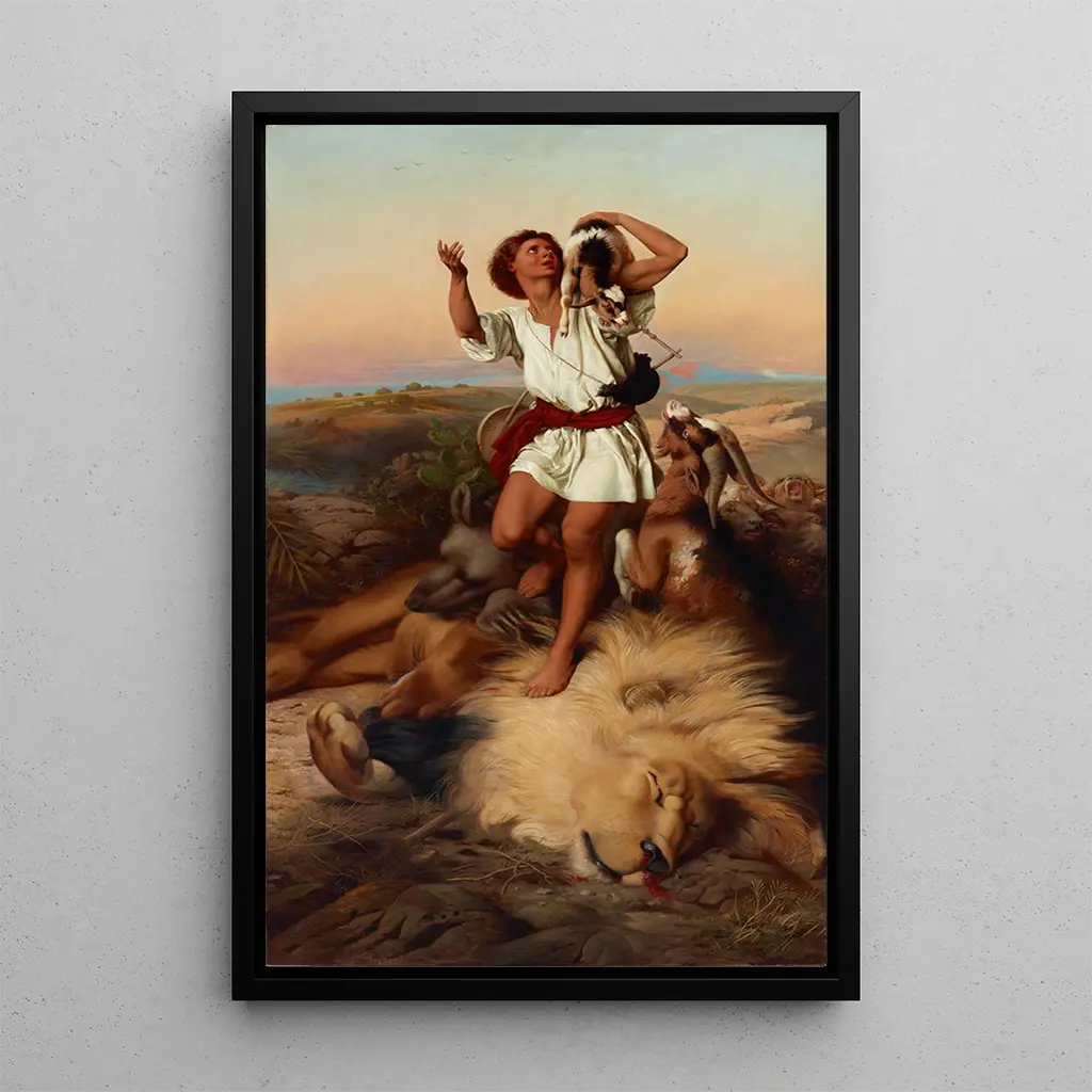 La toile "Première victoire de David" de William Strutt représente un moment historique chargé d'émotion et de symbolisme. Dans cette œuvre, le peintre capture l'instant où le héros David, victorieux, se tient devant Goliath, son adversaire vaincu. Les couleurs vives et les contrastes saisissants accentuent la tension dramatique de la scène. La technique de Strutt, qui mêle réalisme et éléments narratifs, donne vie à cette confrontation épique. L'atmosphère est à la fois triomphante et solennelle, invitant le spectateur à réfléchir sur le courage et la détermination.