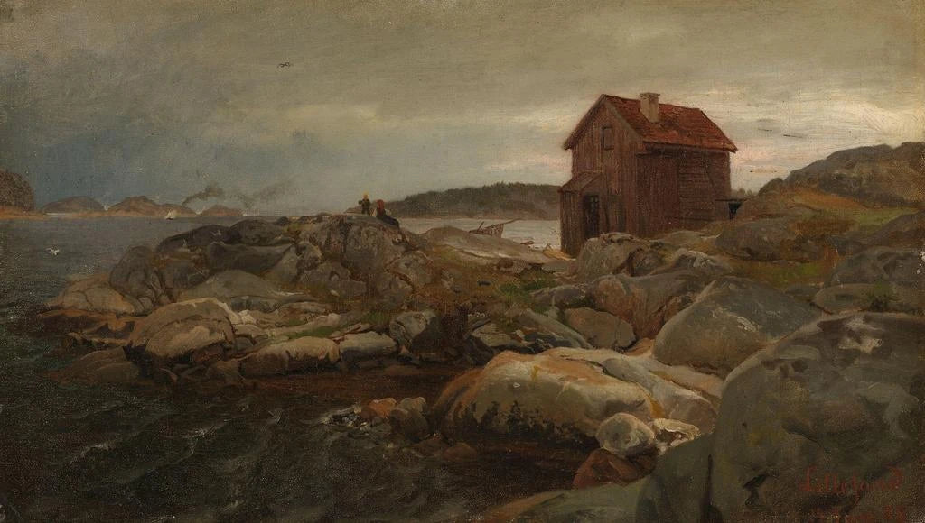 Hans Gude, a Norwegian painter of the 19th century, is renowned for his marine landscapes and representations of Scandinavian nature. Influenced by Romanticism and Realism, he captured the beauty of the Norwegian coasts and scenes of daily life. Gude studied at the Düsseldorf Academy of Fine Arts, where he developed his unique style, blending precision and sensitivity. His career was marked by a series of exhibitions that helped establish his reputation as a major artist of his time. Maison de pêcheur à Lillesand perfectly illustrates his talent for depicting light and the atmosphere of marine landscapes.