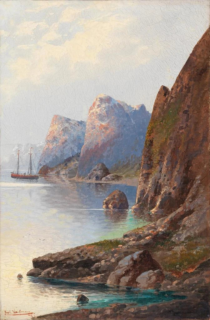 Karl Kaufmann, a painter of the early 20th century, is often associated with the landscape painting school, where he established himself thanks to his unique style. His travels through Scandinavian fjords profoundly influenced his work, allowing him to translate the magnificence of natural scenery onto canvas. Inspired by impressionist techniques, Kaufmann succeeds in conveying the light and atmosphere of the places he depicts. The Fjord Landscape is a perfect example of his talent, demonstrating his commitment to celebrating the beauty of natural environments.