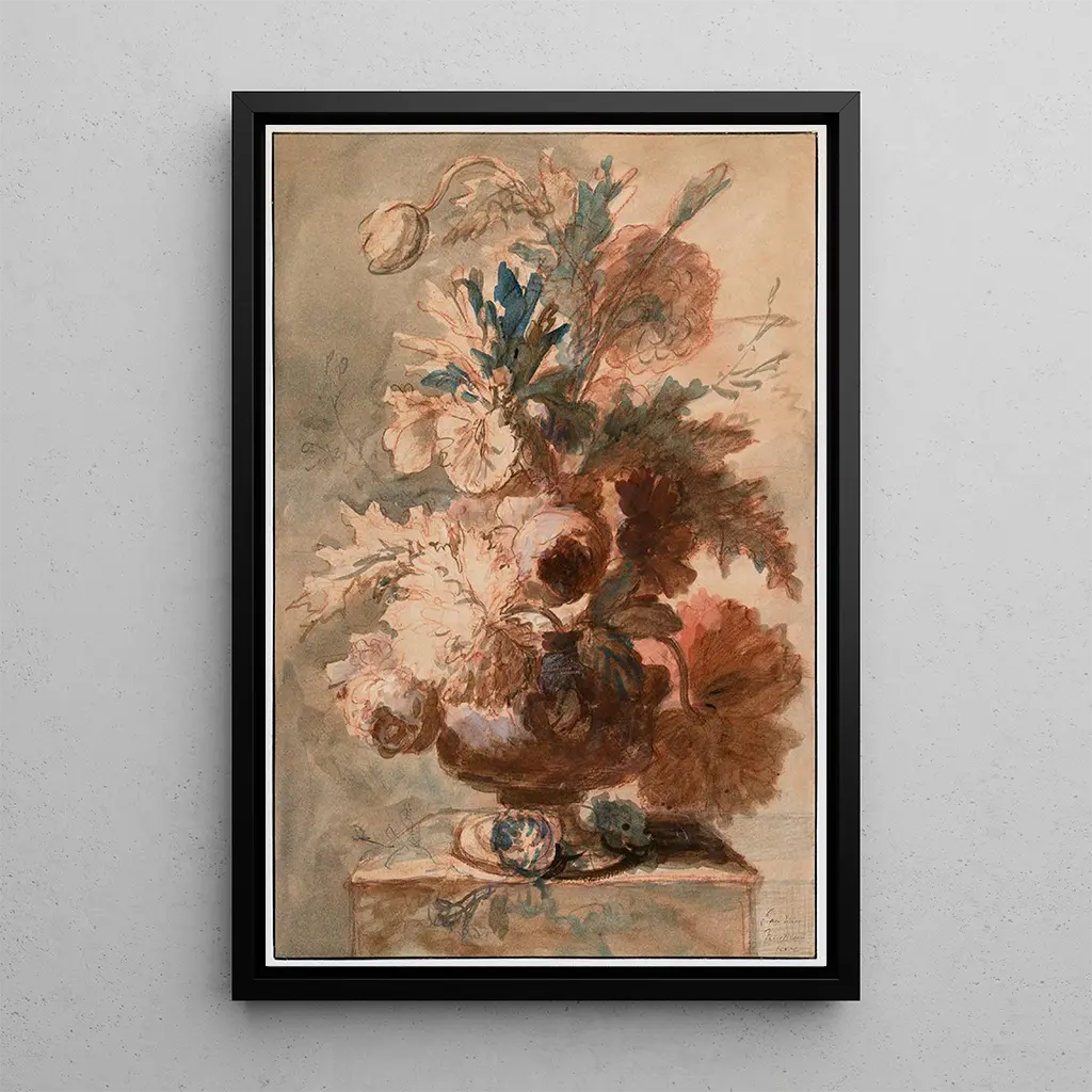 A floral vase: a celebration of nature in colors In this vibrant artwork, Jan van Huysum captures the very essence of floral beauty. The "A floral vase" art print stands out for its harmonious composition, where each flower seems to come to life under the artist's brush. The vivid colors, ranging from deep reds to bright yellows, create a striking contrast that draws the eye. Van Huysum's technique, characterized by meticulous realism and particular attention to detail, gives each petal an almost tangible texture. The atmosphere of this art print is both serene and dynamic, inviting the viewer to immerse themselves in a lush garden, where nature flourishes in all its splendor. Jan van Huysum: master of still life in the 18th century Jan van Huysum, a Dutch painter of the 18th century, is recognized as one of the greatest masters of the still life genre. Influenced by Flemish traditions, he developed a unique style that combines precision and poetry. His career, marked by prolific production, was fueled by meticulous observation of nature and a deep respect for the ephemeral beauty of flowers. Van Huysum was also influenced by contemporaries such as Rachel Ruysch, but his distinctive approach allowed him to stand out in the art world. His works, often commissioned by the aristocracy, testify to the importance of nature in the art of his time and his lasting legacy. A decorative acquisition with multiple virtues The art print "A floral vase" is a decorative piece that harmoniously fits into various spaces, whether a living room, an office, or a bedroom. Its print quality and fidelity to the original colors make this canvas an ideal choice for those wishing to bring a touch of nature into their interior. The aesthetic appeal of this art print lies not only in its visual beauty but also in the emotion it evokes. By choosing this reproduction, you opt for a painting that evokes serenity and joy, while enriching your decor with a touch of timeless elegance.