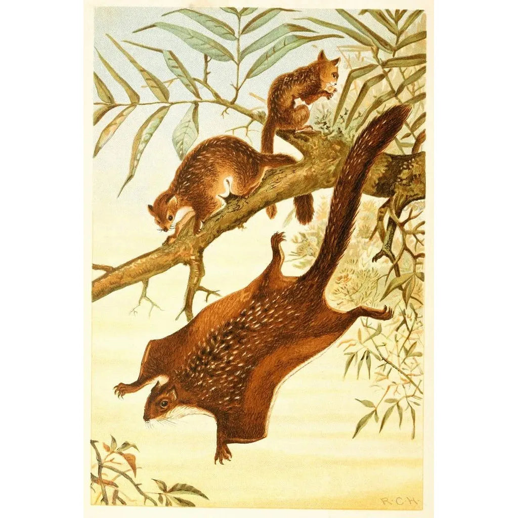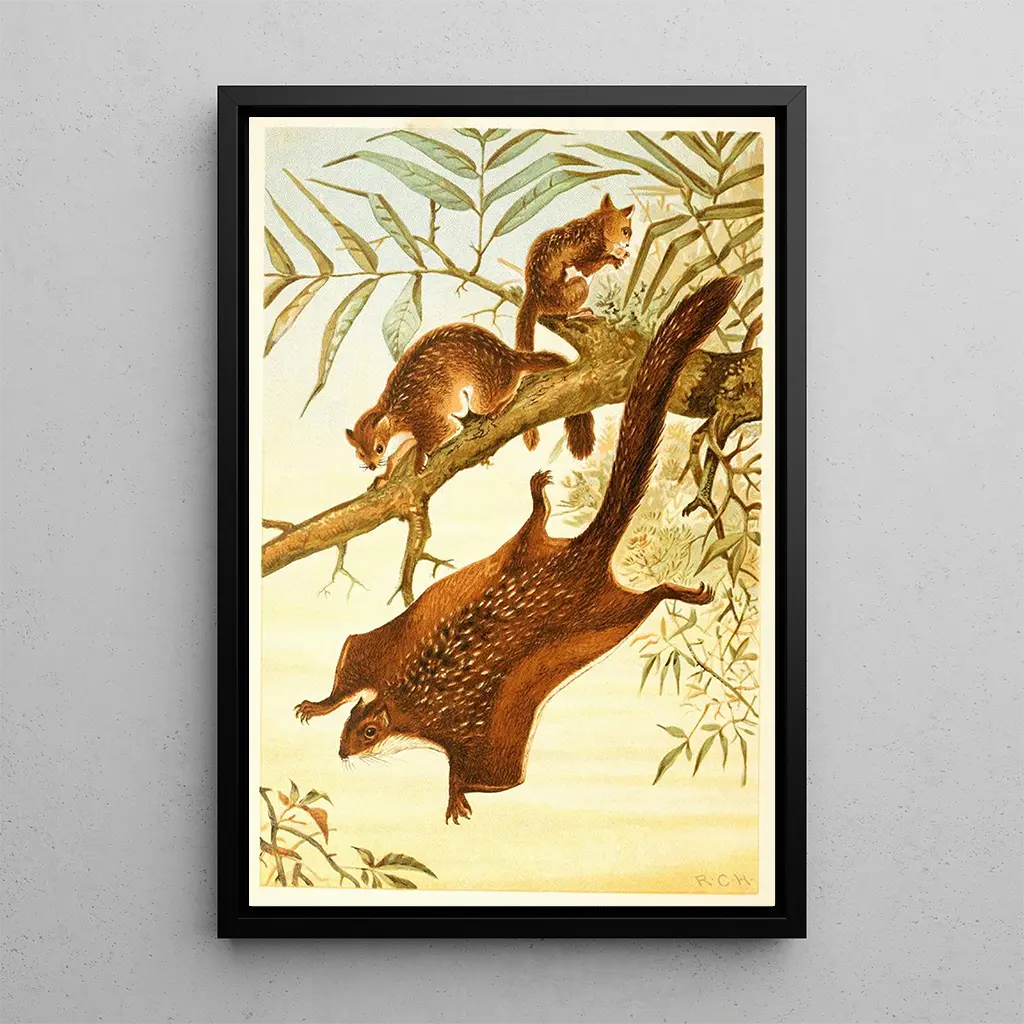 Squirrel in Flight: An Aerial Dance in the Canopies The artwork titled "Squirrel in Flight" evokes the lightness and grace of this fascinating animal. Captured in a moment of flight, the squirrel appears to defy gravity, with its paws outstretched and its tail fanned out. The warm, natural colors, ranging from earthy browns to vibrant greens, create a lively and dynamic atmosphere. The technique used, likely watercolor or oil painting, allows for a realistic rendering of the fur texture and the luminosity of the leaves, immersing the viewer in a world where nature reigns supreme. This art print invites a soothing contemplation, reminding us of the fleeting beauty of wild moments. Anonymous: a reflection of wild nature through the ages The artist of this work, though remaining anonymous, offers us a valuable glimpse into animal art, which has endured through the centuries. This depiction of the squirrel in flight fits within an artistic tradition where fauna is highlighted, often to celebrate the beauty and diversity of nature. The influences of the period, marked by a growing interest in observing animals in their natural habitat, are palpable. Artists of this era sought to capture not only the external appearance of creatures but also their essence, movement, and interaction with their environment. This painting bears witness to this artistic quest, while remaining accessible and timeless. A decorative acquisition with multiple assets The art print of "Squirrel in Flight" makes an ideal decorative addition to various living spaces. Whether in a living room, office, or bedroom, this canvas brings a touch of nature and serenity. Its printing quality guarantees faithful reproduction of the colors and details of the original work, allowing you to enjoy vibrant art daily. The aesthetic appeal of this piece lies in its ability to inspire wonder and spark conversations. By integrating this art print into your interior, you invite not only the beauty of nature but also a touch of mystery and poetry, enriching your environment.